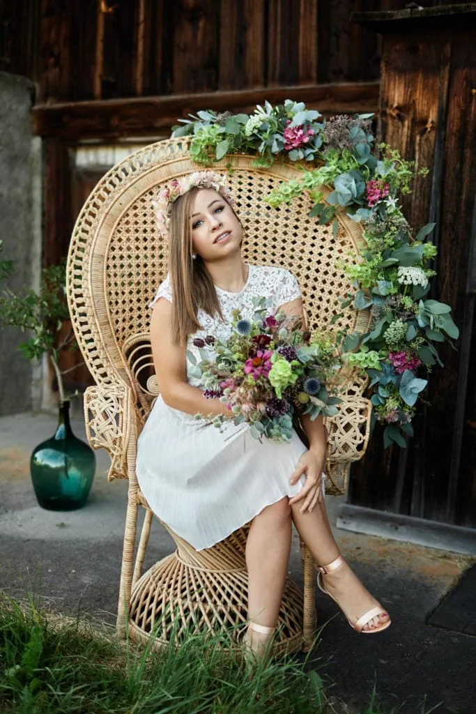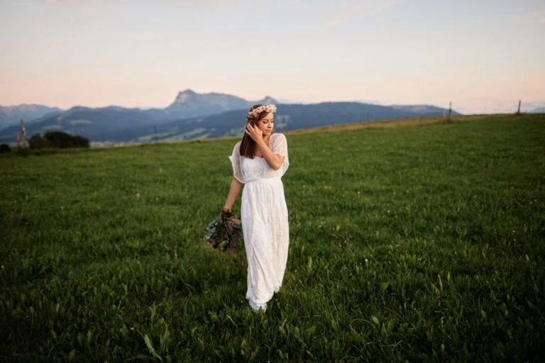 En ces temps où les mariages doivent se faire en petit comité, je vous propose de retourner en été pour une séance photo près d’une vieille grange avec vue sur les Préalpes fribourgeoises. Un endroit en pleine nature, au calme, loin de toute civilisation ou Michele a dressé une jolie table pour un repas de mariage champêtre en toute intimité. Mélina s’est prêtée au jeu de la mariée afin de sublimer le bouquet et la couronne de fleurs.