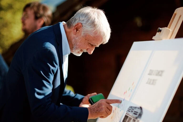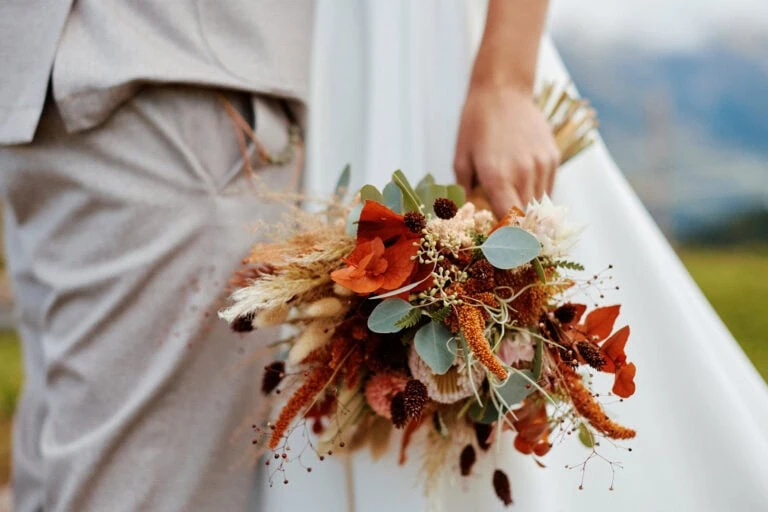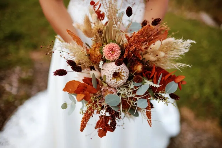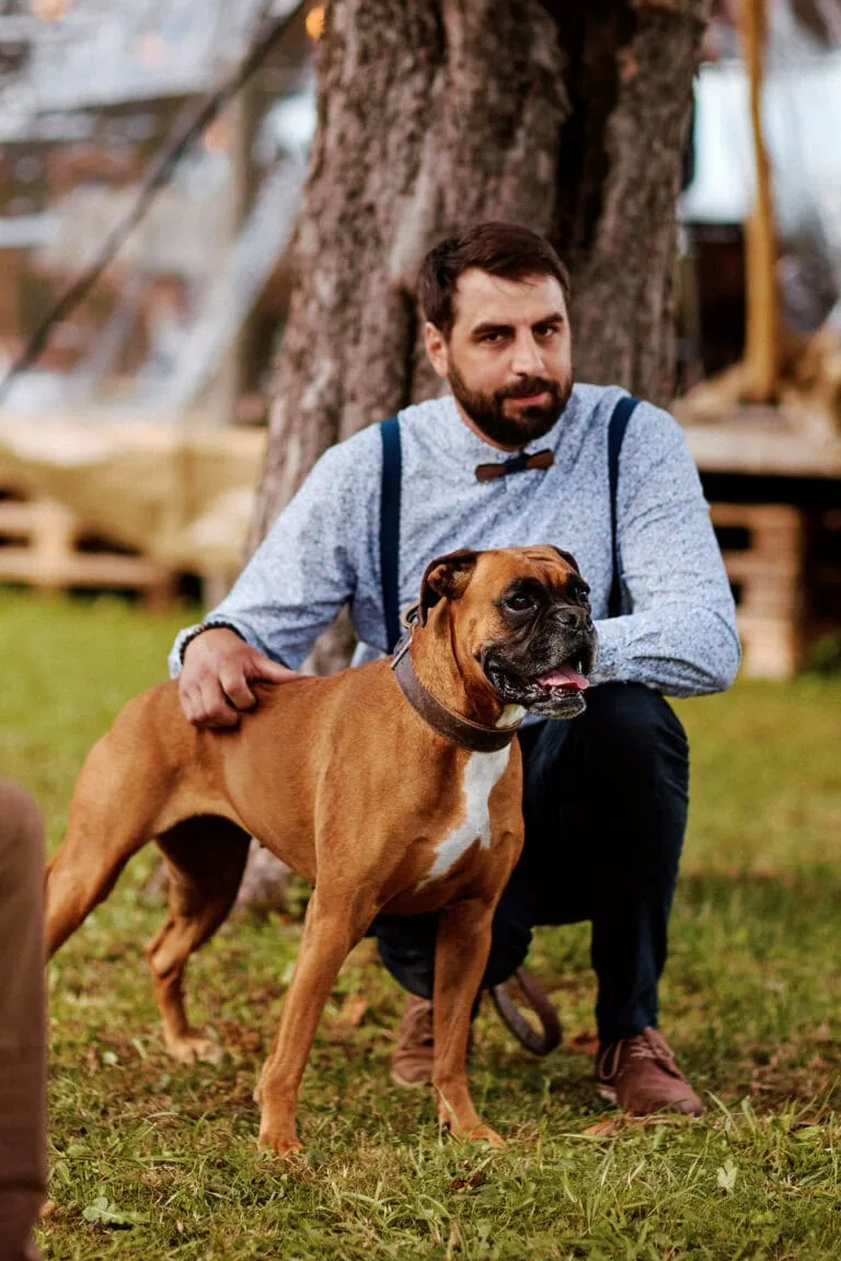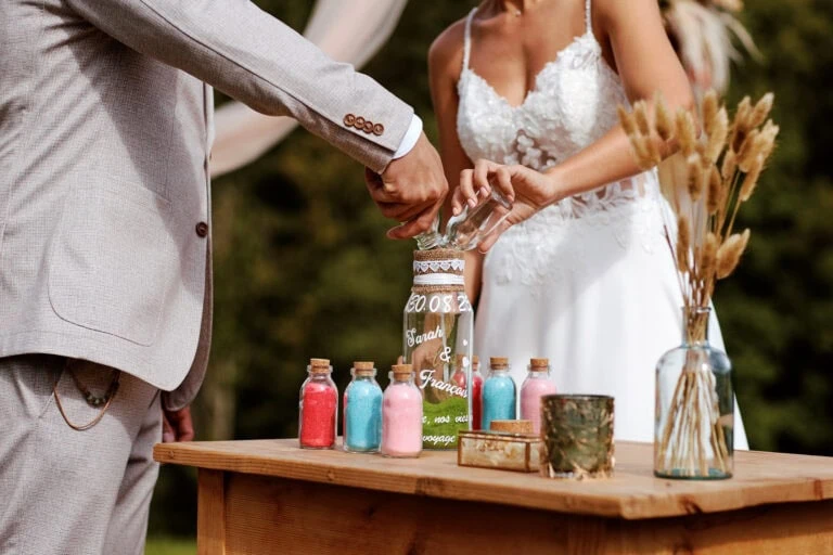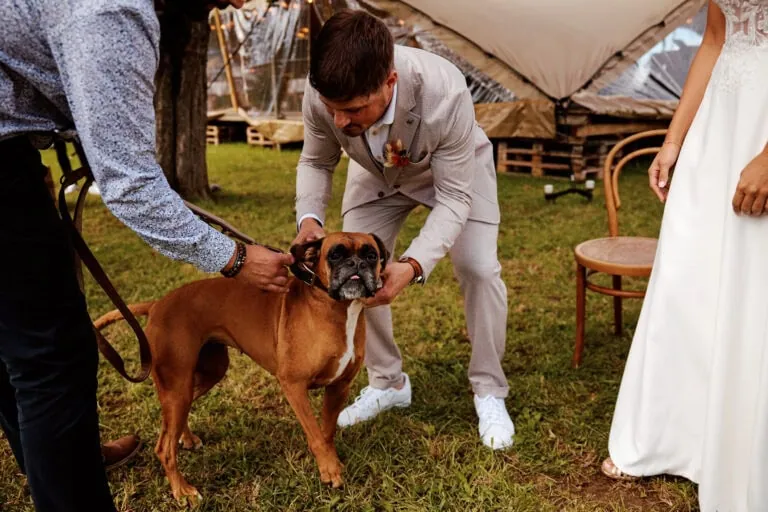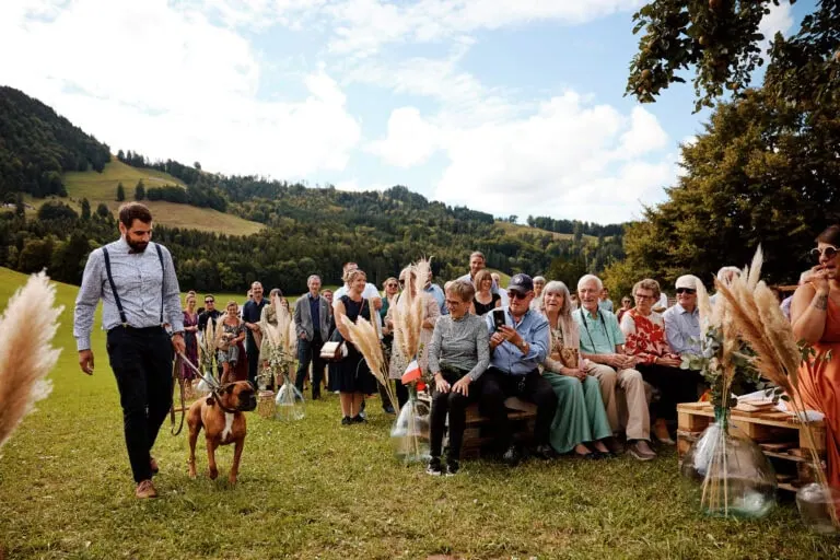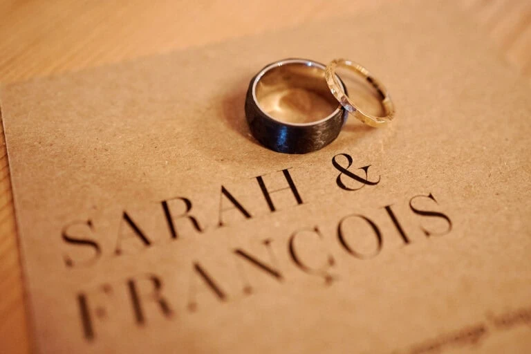 Après leurs entrées, leur histoire racontée par l’officiante, il y a eu les discours des témoins, un moment magnifique ! Et puis il y a eu Gaya, leur chien, qui a apporté les alliances. Je ne vais pas mentir, je n’étais pas au courant, Sarah et François non plus. Une surprise organisée par leurs familles (bon, les mariés s’en doutaient un peu, et sûrement qu’ils espéraient que ça se produise). Il a assuré. Échange de vœux, échange d’alliances, quelques larmes dans l’assemblée. Puis une sortie sous une pluie de pétales de fleurs séchés, un magnifique moment !