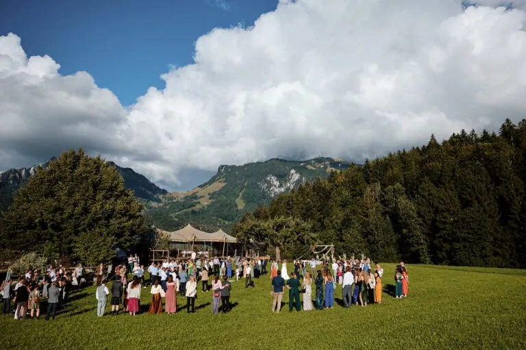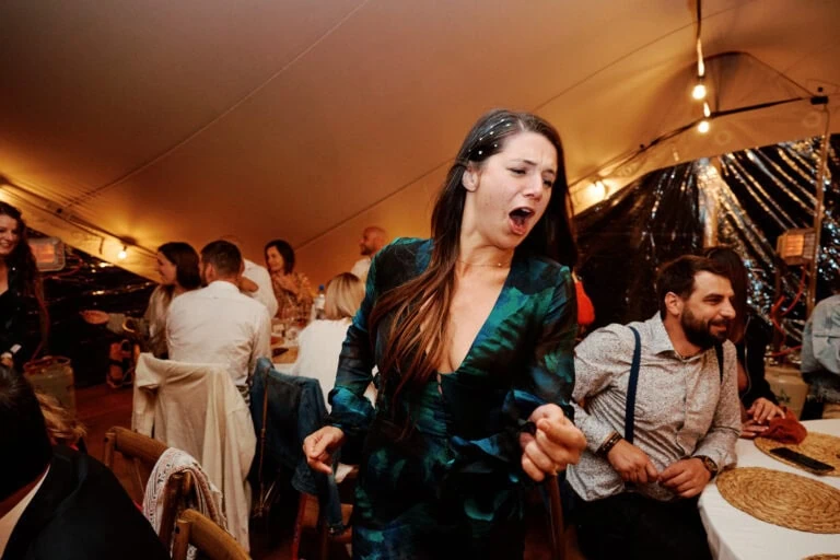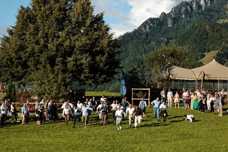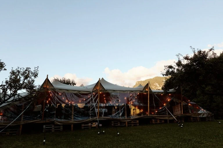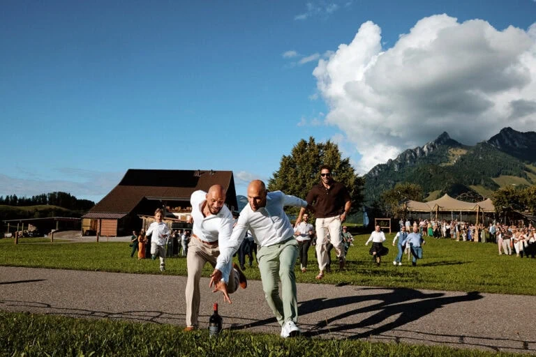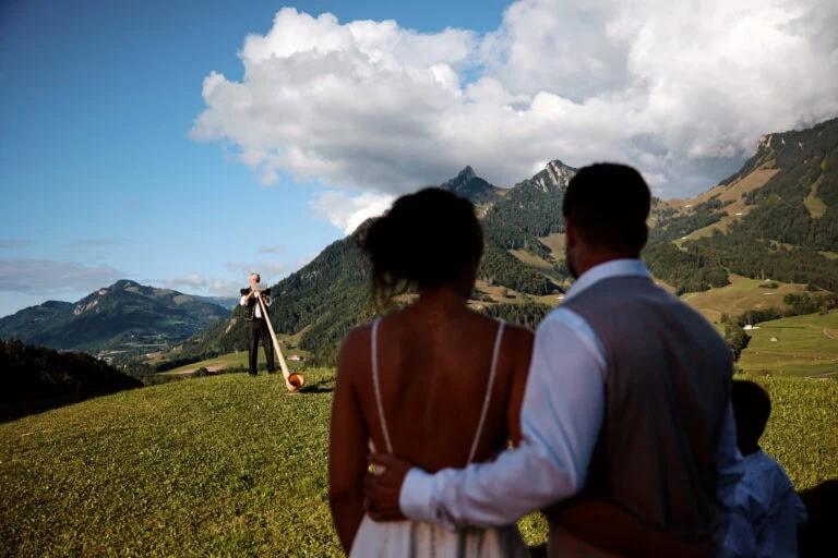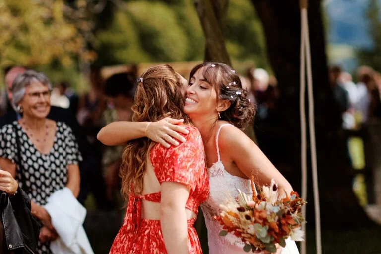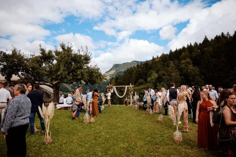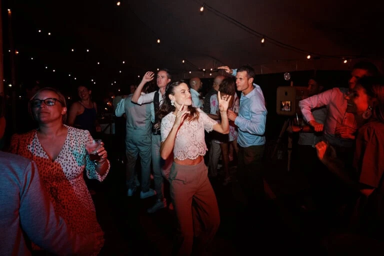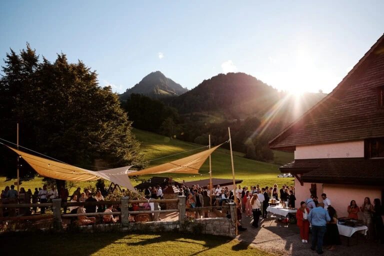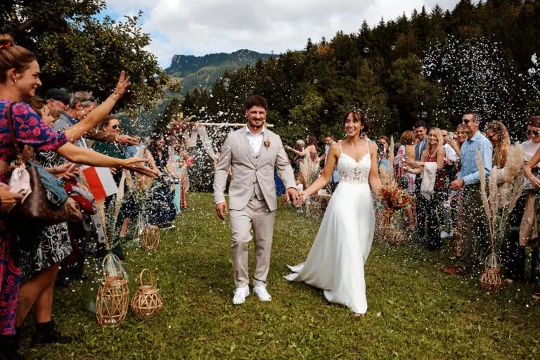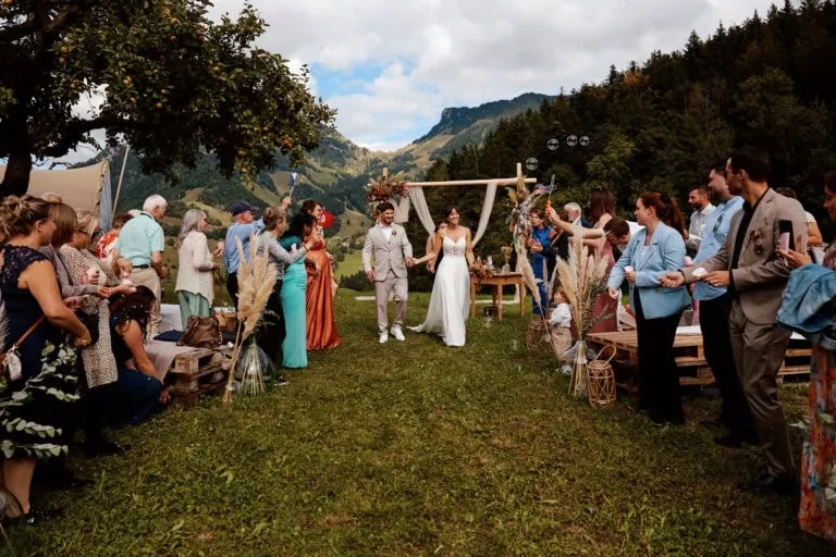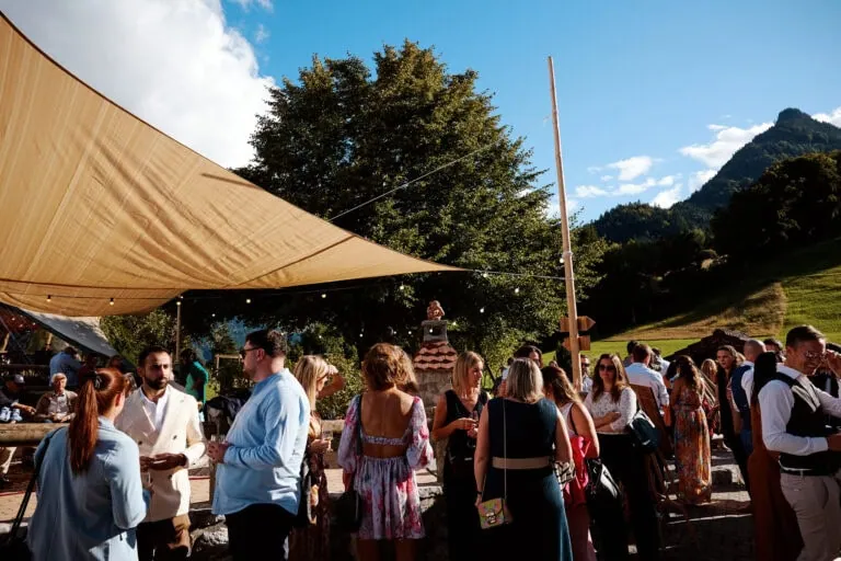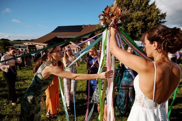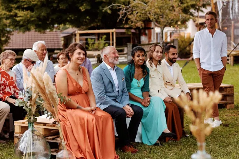 L’apéritif s’est déroulé près de la ferme, dans cette atmosphère détendue qu’on a seulement quand on est chez soi, les invités qui se posent, les enfants qui courent. Et des surprises, comme le papa de François, musicien dans l’âme, qui joue un morceau au Cor des Alpes. Oui, une vraie surprise, les mariés ne savaient tout simplement pas qu’il jouait du Cor des Alpes. Après la cérémonie du bouquet avec des rubans que Sarah coupait, les garçons se sont livrés à une drôle de course pour une bouteille de vin ! Puis la soirée a continué sous une tente de style berbère, avec des jeux, des animations, et une première danse qui a lancé le reste de la nuit.