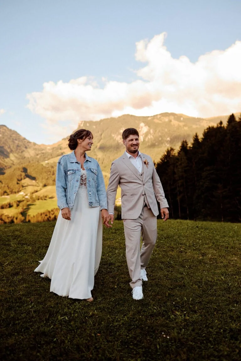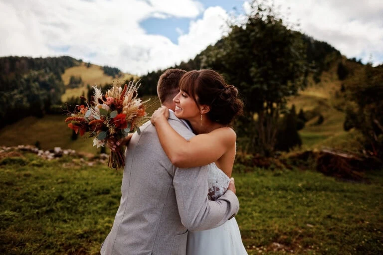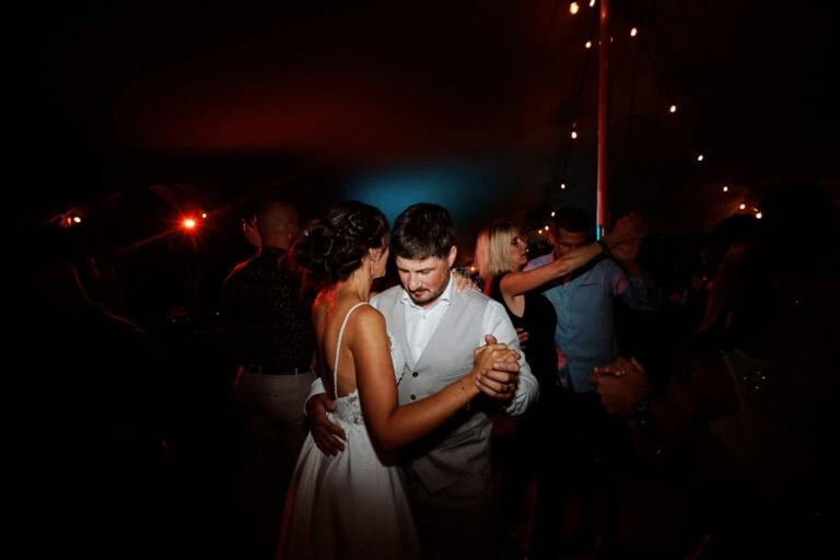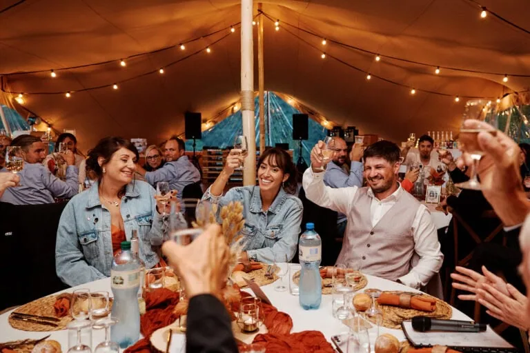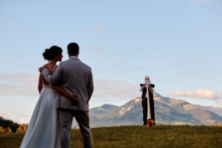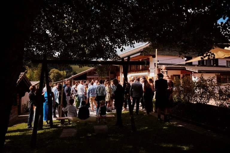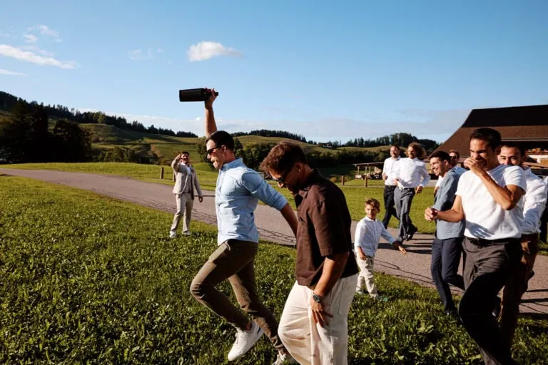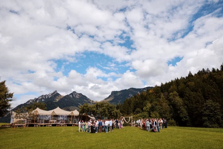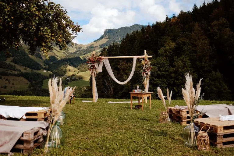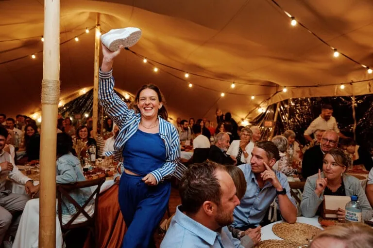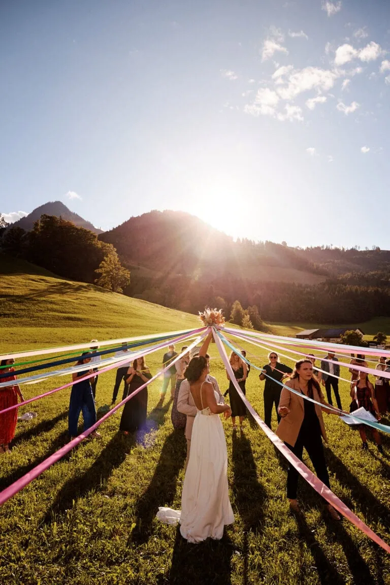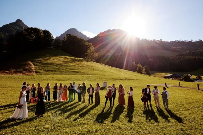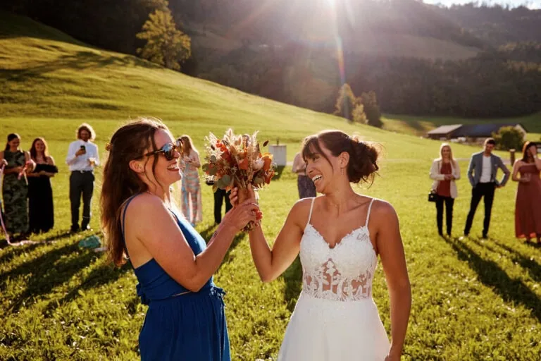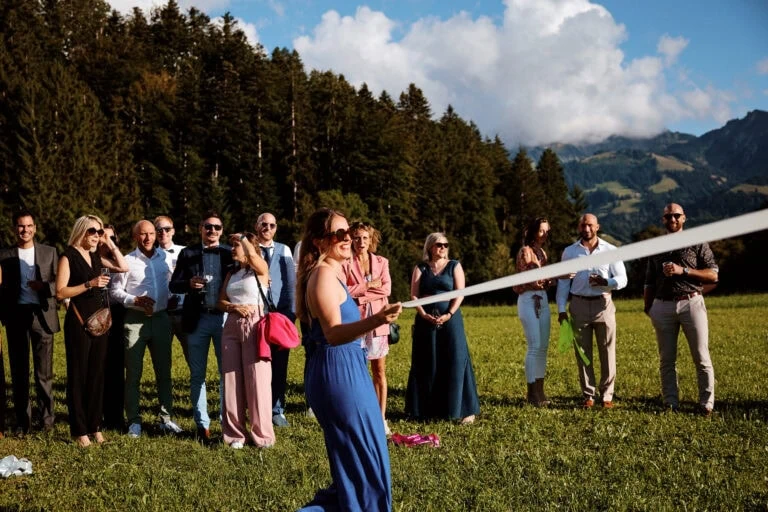 L’apéritif s’est déroulé près de la ferme, dans cette atmosphère détendue qu’on a seulement quand on est chez soi, les invités qui se posent, les enfants qui courent. Et des surprises, comme le papa de François, musicien dans l’âme, qui joue un morceau au Cor des Alpes. Oui, une vraie surprise, les mariés ne savaient tout simplement pas qu’il jouait du Cor des Alpes. Après la cérémonie du bouquet avec des rubans que Sarah coupait, les garçons se sont livrés à une drôle de course pour une bouteille de vin ! Puis la soirée a continué sous une tente de style berbère, avec des jeux, des animations, et une première danse qui a lancé le reste de la nuit.