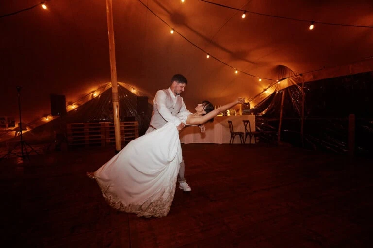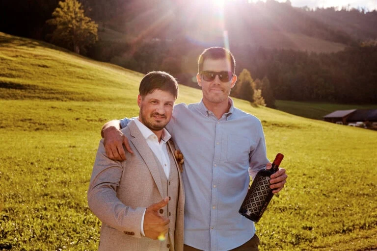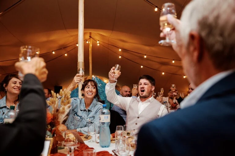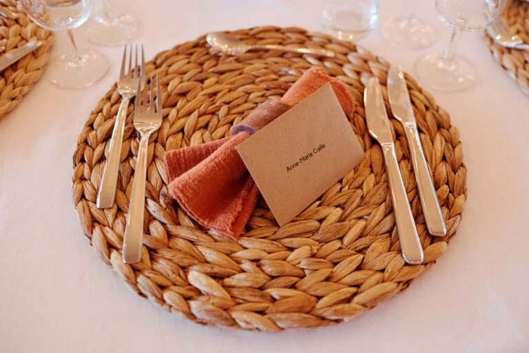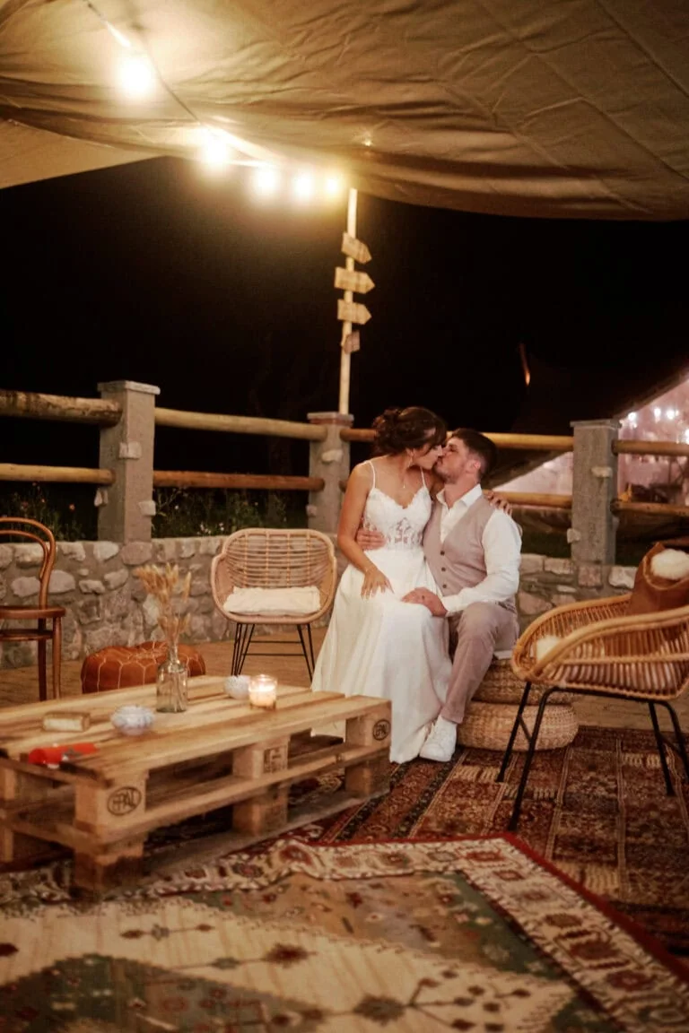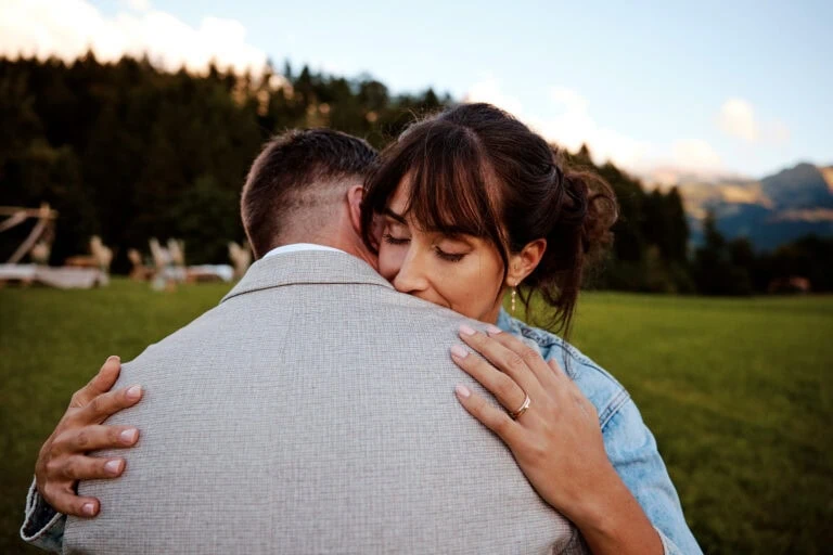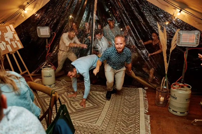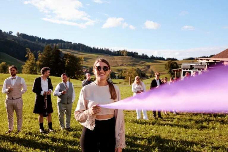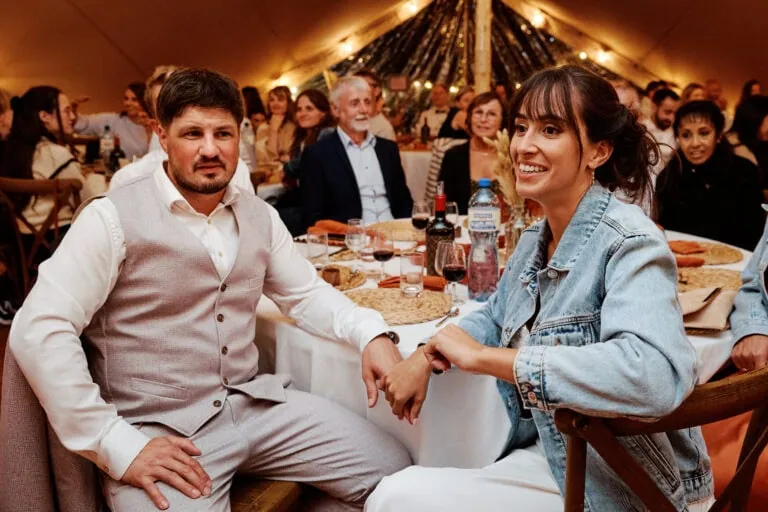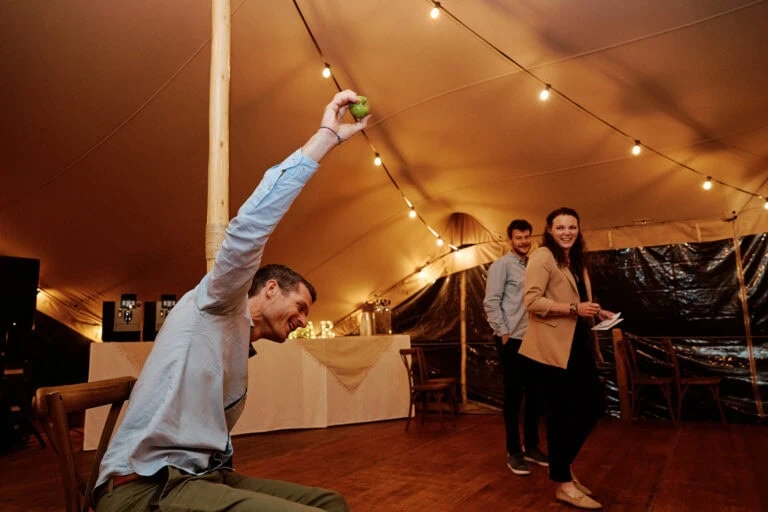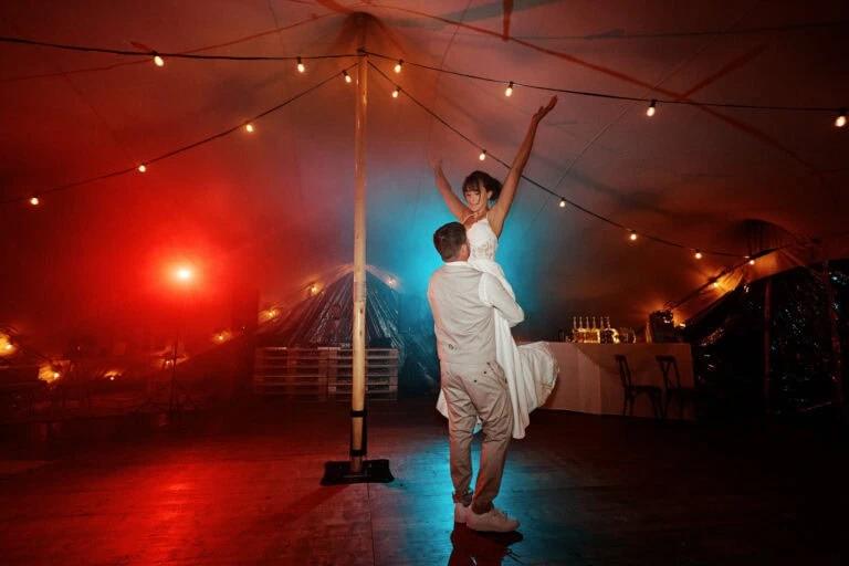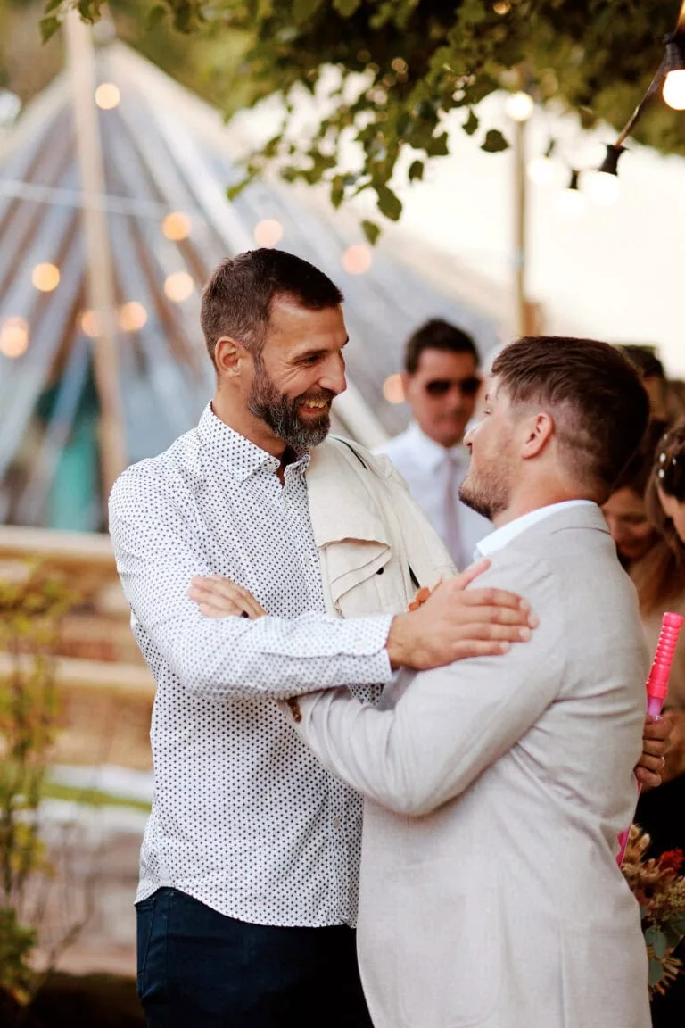L’apéritif s’est déroulé près de la ferme, dans cette atmosphère détendue qu’on a seulement quand on est chez soi, les invités qui se posent, les enfants qui courent. Et des surprises, comme le papa de François, musicien dans l’âme, qui joue un morceau au Cor des Alpes. Oui, une vraie surprise, les mariés ne savaient tout simplement pas qu’il jouait du Cor des Alpes. Après la cérémonie du bouquet avec des rubans que Sarah coupait, les garçons se sont livrés à une drôle de course pour une bouteille de vin ! Puis la soirée a continué sous une tente de style berbère, avec des jeux, des animations, et une première danse qui a lancé le reste de la nuit.