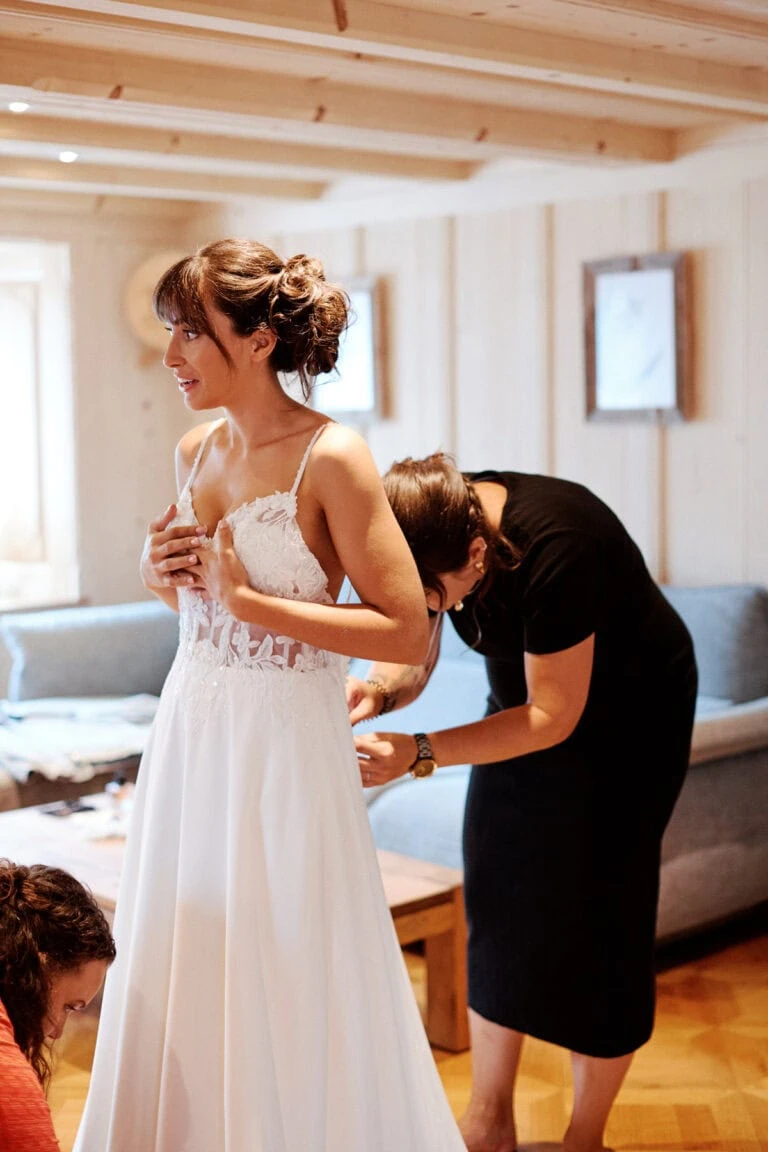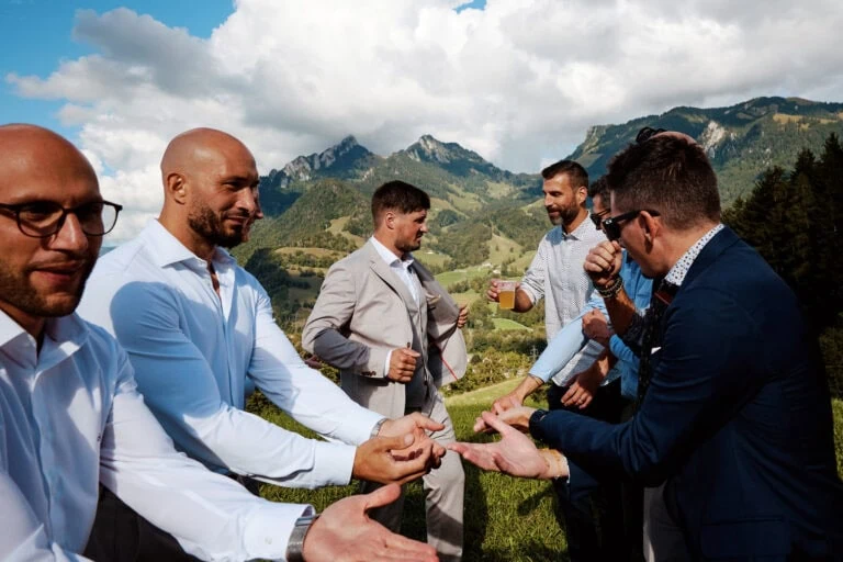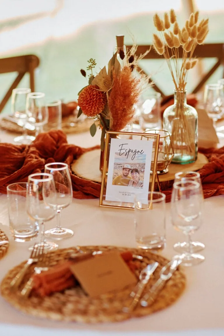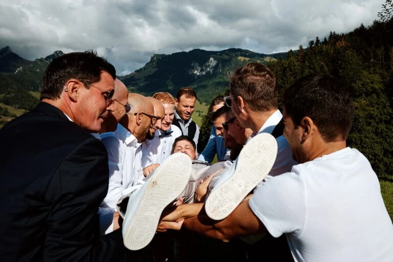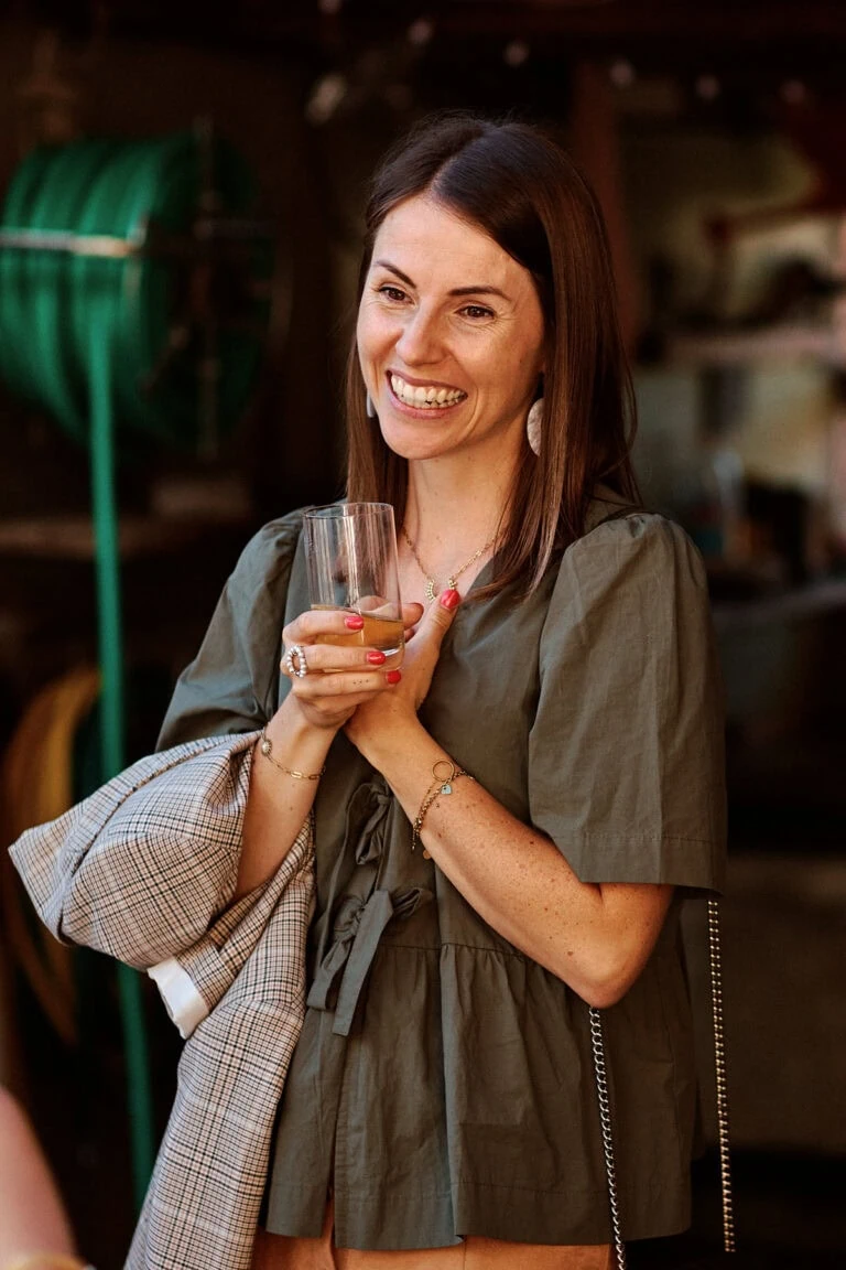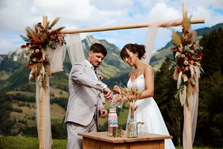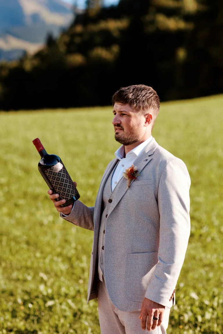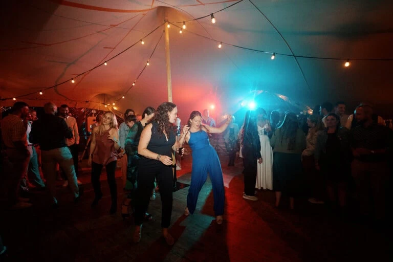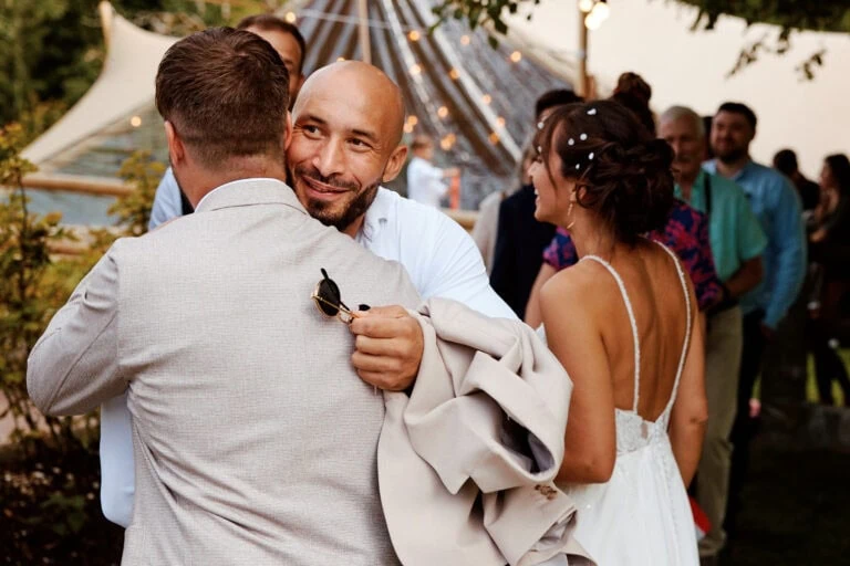 L’apéritif s’est déroulé près de la ferme, dans cette atmosphère détendue qu’on a seulement quand on est chez soi, les invités qui se posent, les enfants qui courent. Et des surprises, comme le papa de François, musicien dans l’âme, qui joue un morceau au Cor des Alpes. Oui, une vraie surprise, les mariés ne savaient tout simplement pas qu’il jouait du Cor des Alpes. Après la cérémonie du bouquet avec des rubans que Sarah coupait, les garçons se sont livrés à une drôle de course pour une bouteille de vin ! Puis la soirée a continué sous une tente de style berbère, avec des jeux, des animations, et une première danse qui a lancé le reste de la nuit.