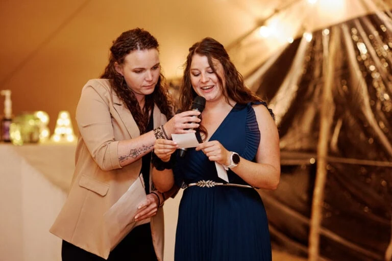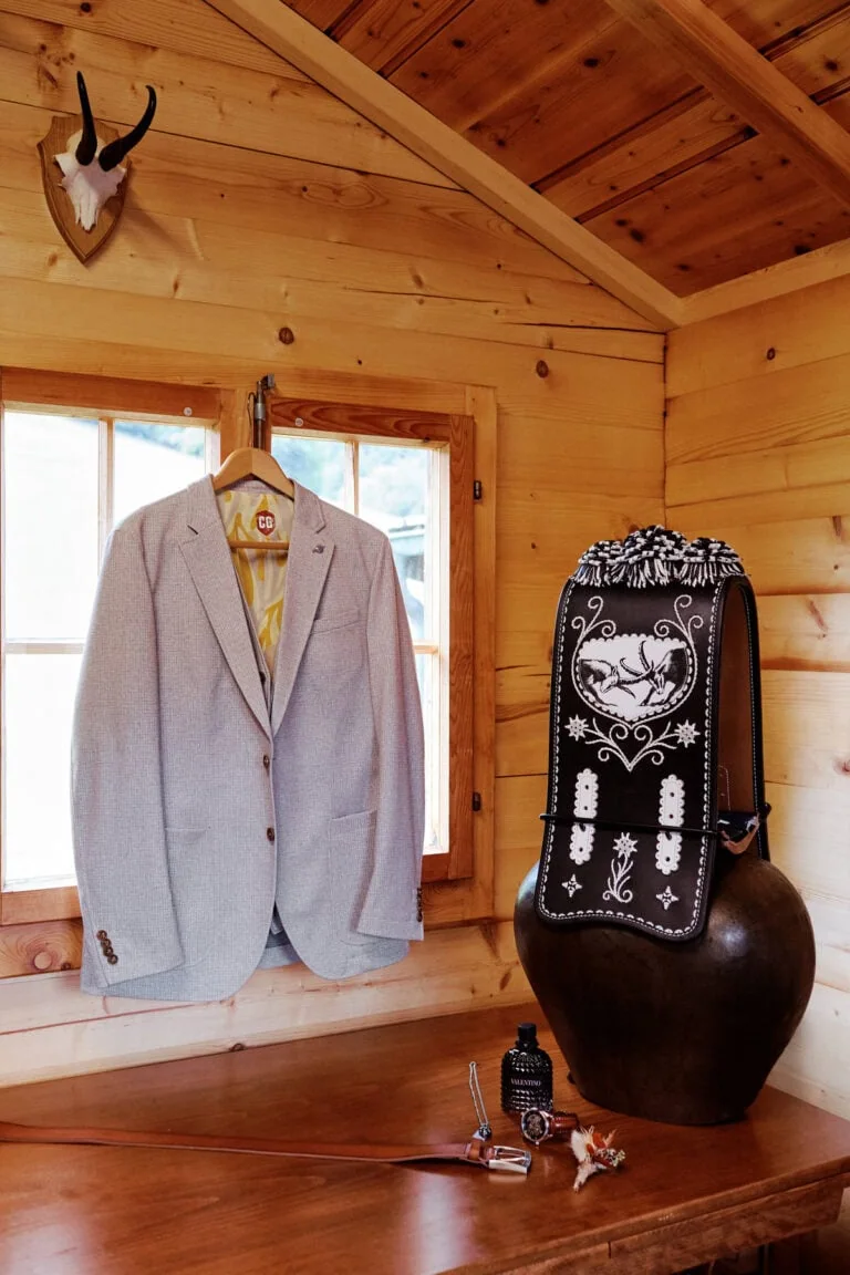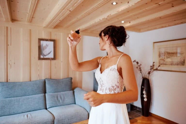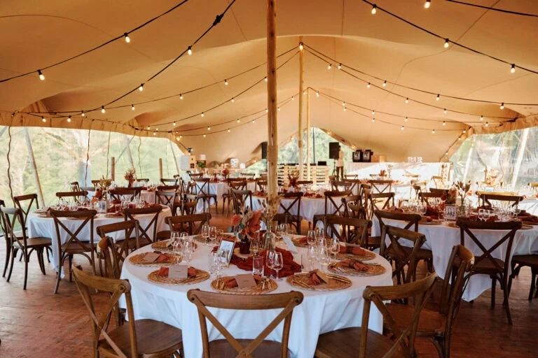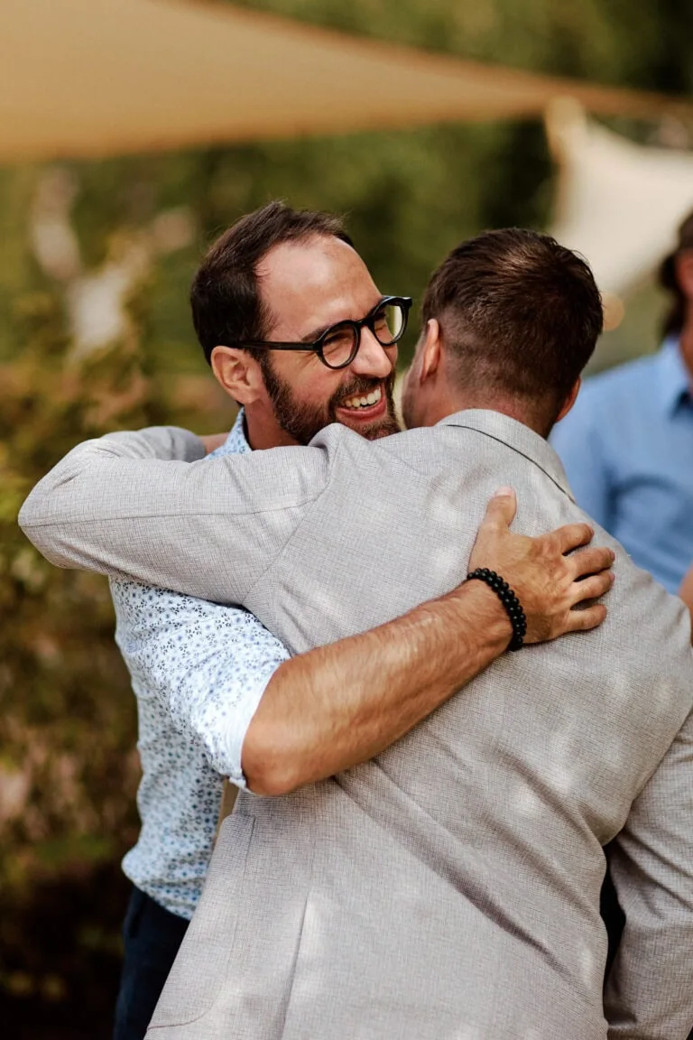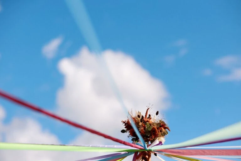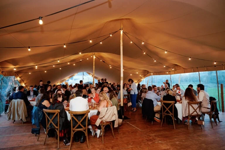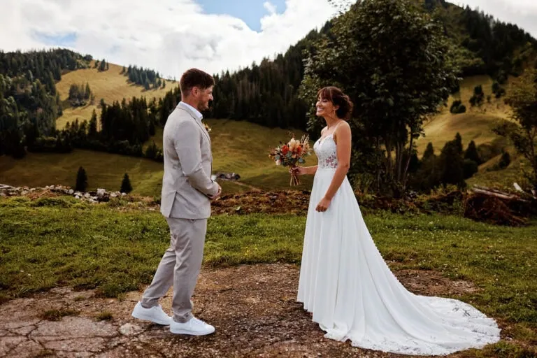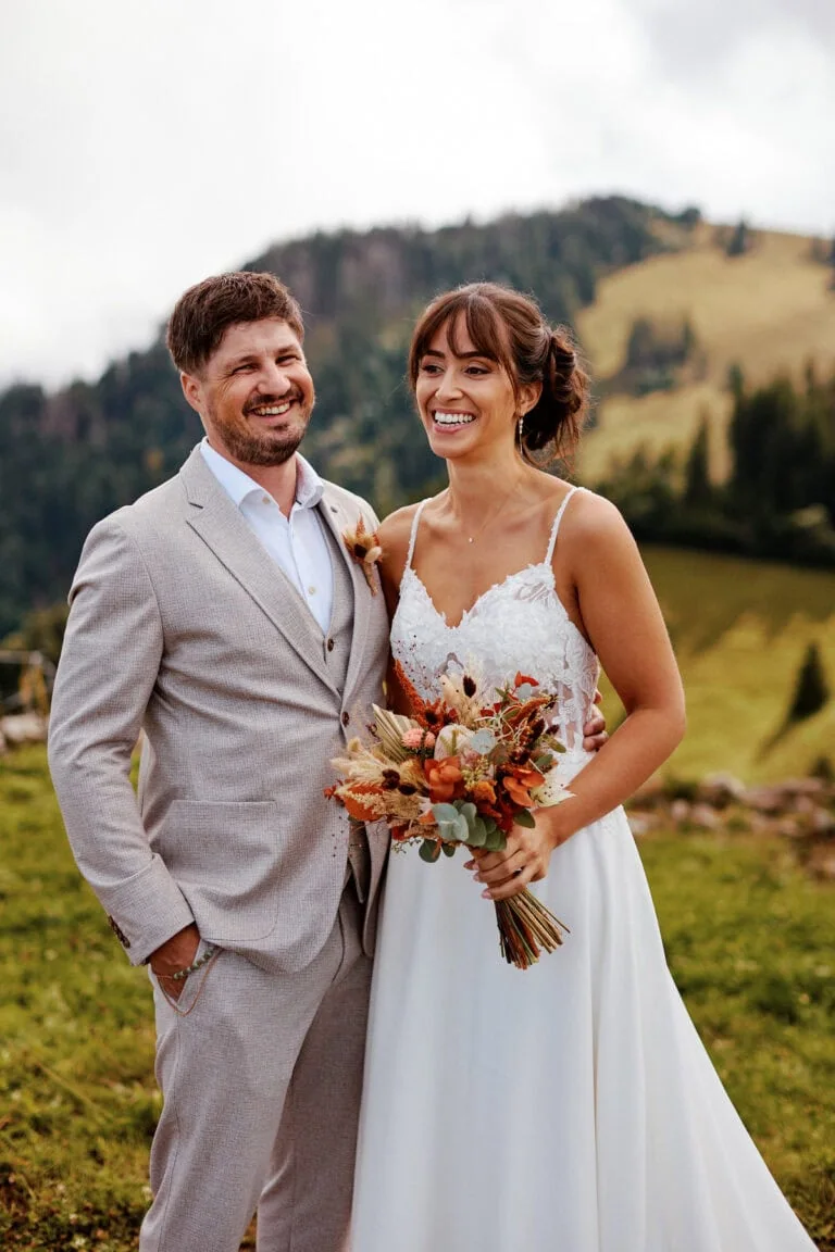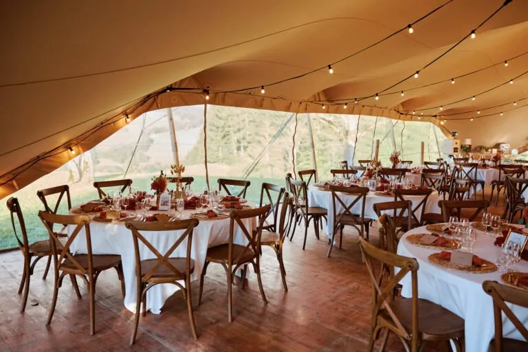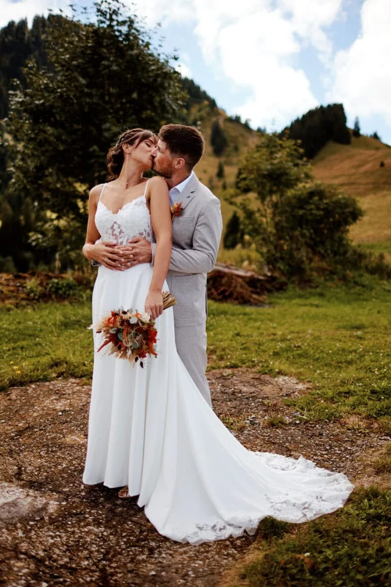 L’apéritif s’est déroulé près de la ferme, dans cette atmosphère détendue qu’on a seulement quand on est chez soi, les invités qui se posent, les enfants qui courent. Et des surprises, comme le papa de François, musicien dans l’âme, qui joue un morceau au Cor des Alpes. Oui, une vraie surprise, les mariés ne savaient tout simplement pas qu’il jouait du Cor des Alpes. Après la cérémonie du bouquet avec des rubans que Sarah coupait, les garçons se sont livrés à une drôle de course pour une bouteille de vin ! Puis la soirée a continué sous une tente de style berbère, avec des jeux, des animations, et une première danse qui a lancé le reste de la nuit.