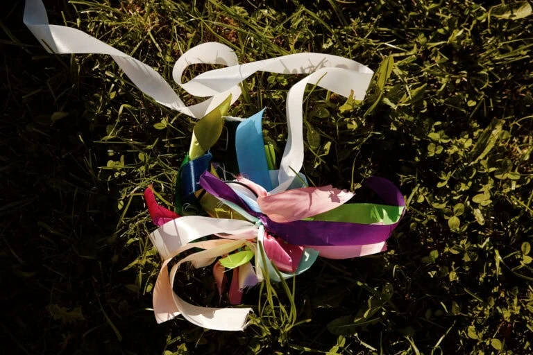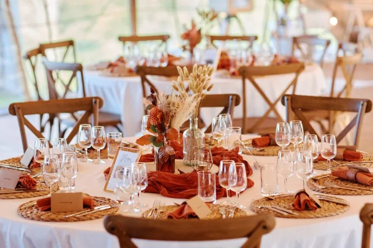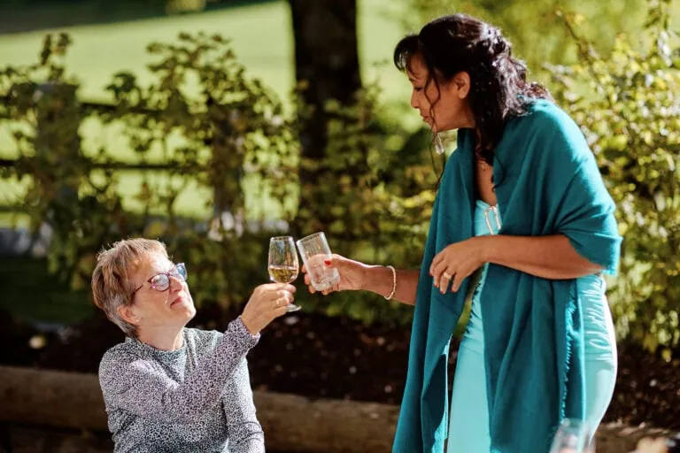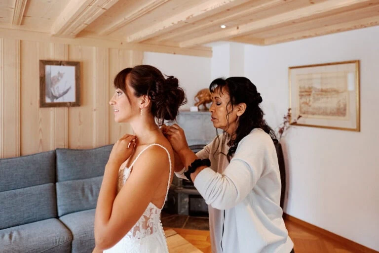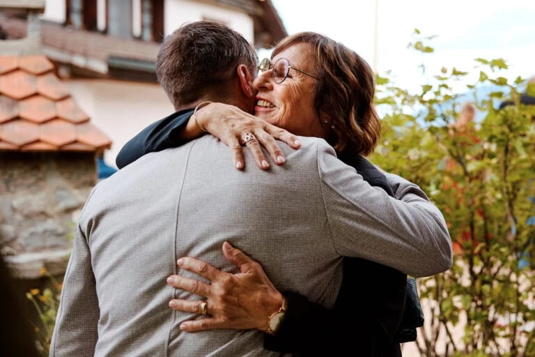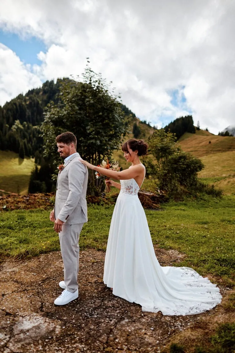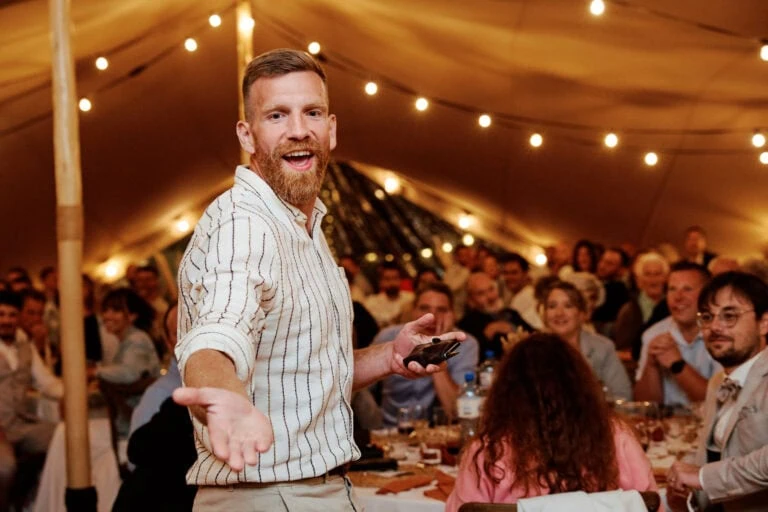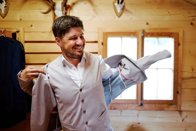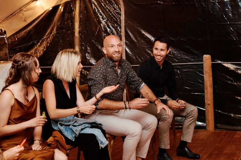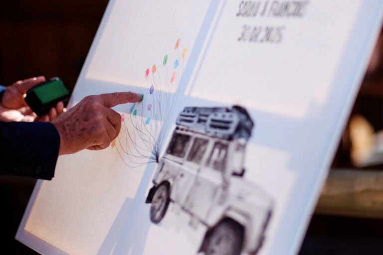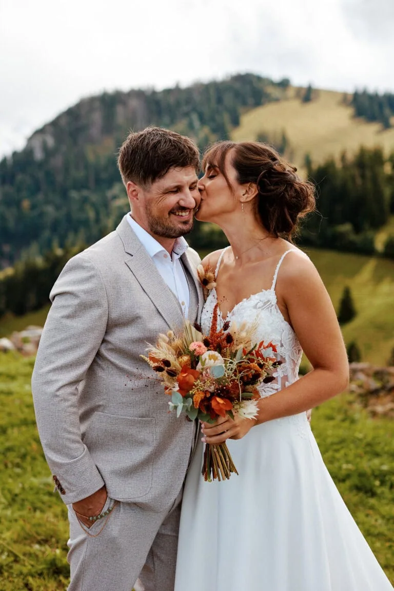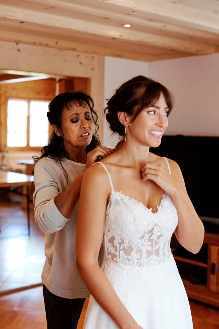L’apéritif s’est déroulé près de la ferme, dans cette atmosphère détendue qu’on a seulement quand on est chez soi, les invités qui se posent, les enfants qui courent. Et des surprises, comme le papa de François, musicien dans l’âme, qui joue un morceau au Cor des Alpes. Oui, une vraie surprise, les mariés ne savaient tout simplement pas qu’il jouait du Cor des Alpes. Après la cérémonie du bouquet avec des rubans que Sarah coupait, les garçons se sont livrés à une drôle de course pour une bouteille de vin ! Puis la soirée a continué sous une tente de style berbère, avec des jeux, des animations, et une première danse qui a lancé le reste de la nuit.