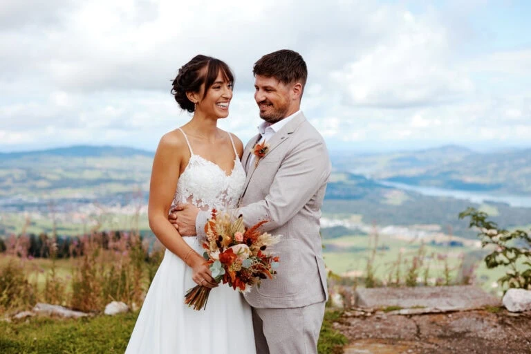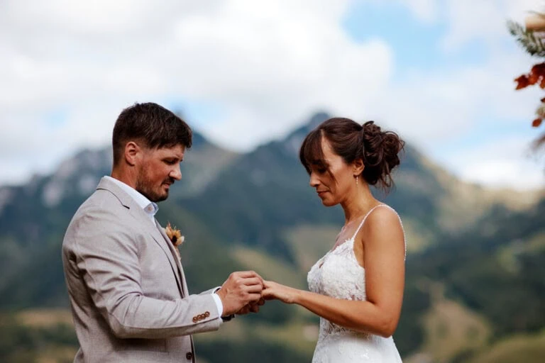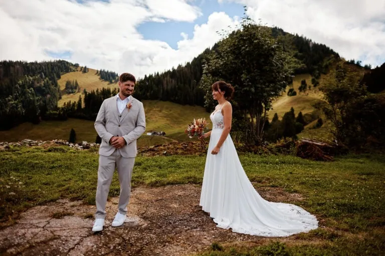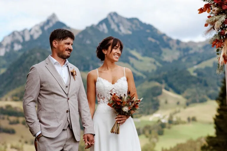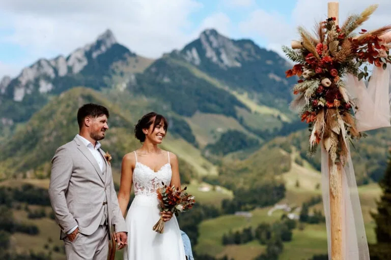 Il y a des mariages laïcs qui se passent dans de magnifiques salles avec une belle charpente en bois, ou une salle des fêtes un peu plus sobre. Et il y a des mariages où tout a un sens, même le lieu de la cérémonie, comme celui de Sarah et François. Un pré. Une ferme familiale. Les Vanils en arrière-plan. Et une mariée qui arrive à cheval !
