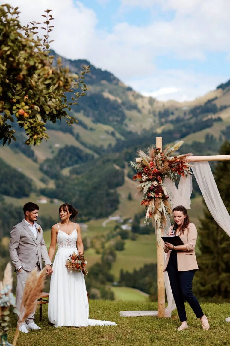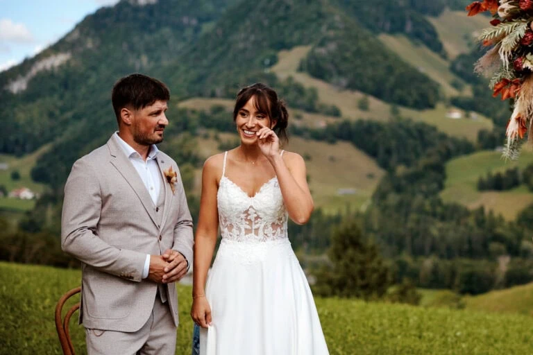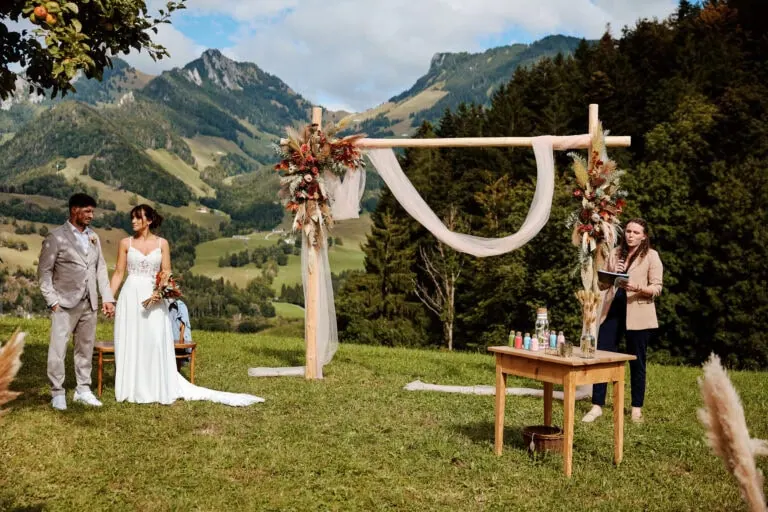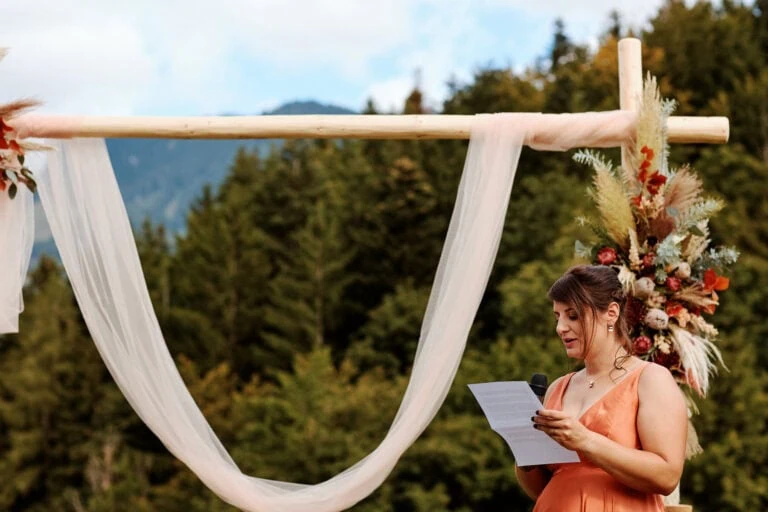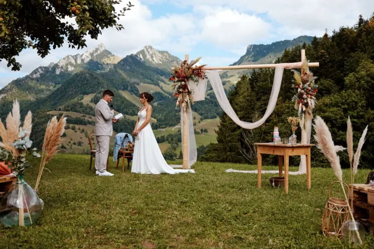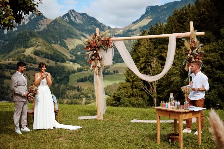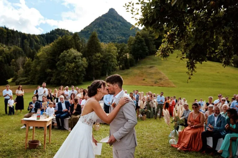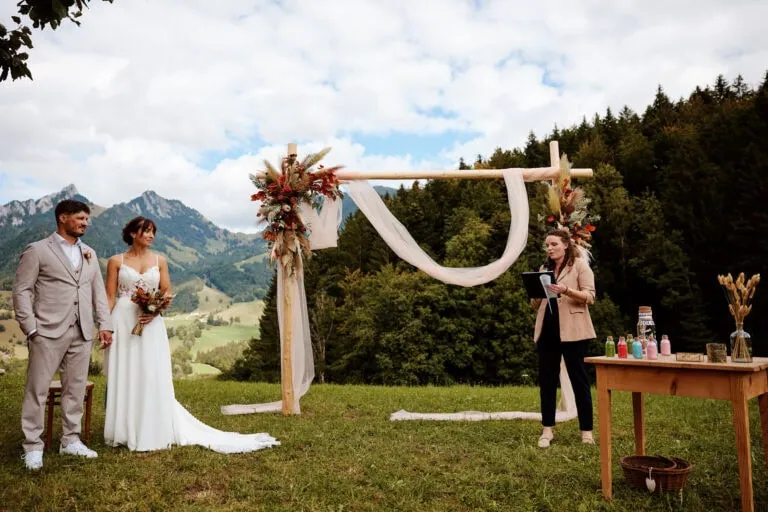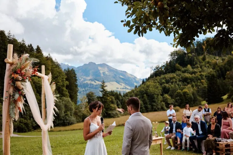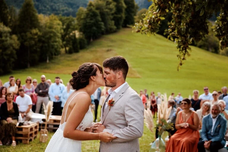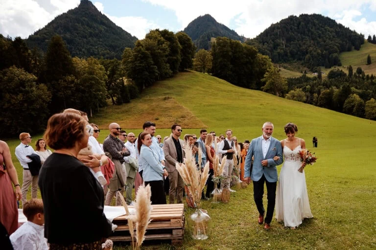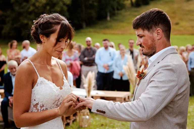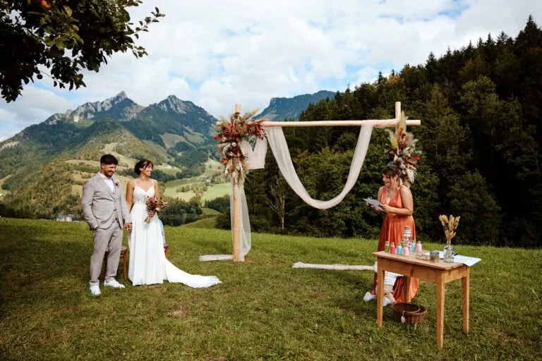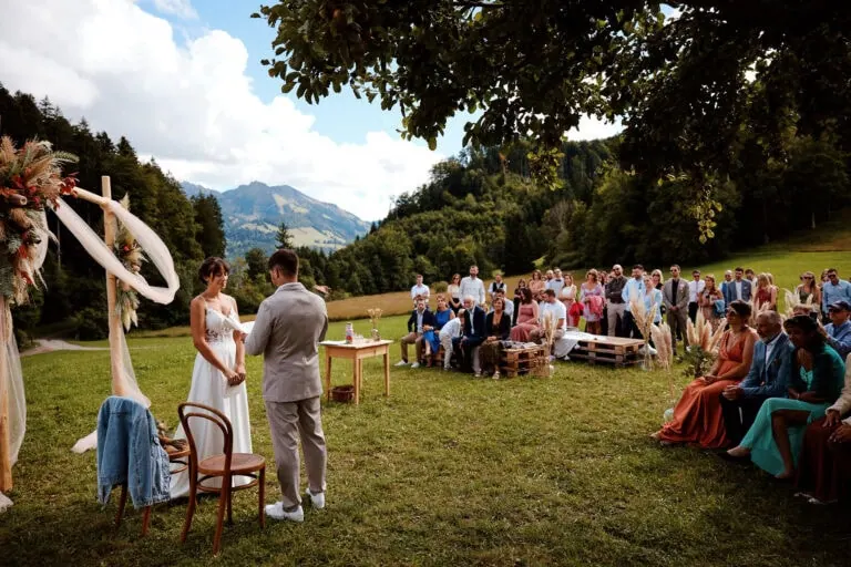La cérémonie laïque s’est tenue en plein air, malgré une bonne pluie le matin, dans le pré juste à côté de la ferme. François est arrivé en 4×4, efficace. Sarah, elle, a fait son entrée à cheval, sa passion. Difficile de faire mieux pour une première apparition. Le genre de moment où tout le monde retient son souffle, surtout Sarah, et où moi j’ai le cœur qui palpite ! J’adore !