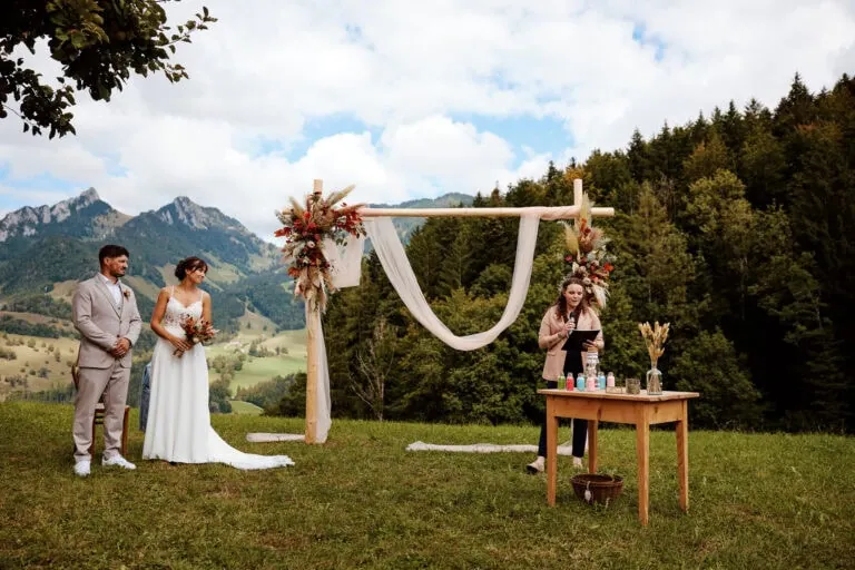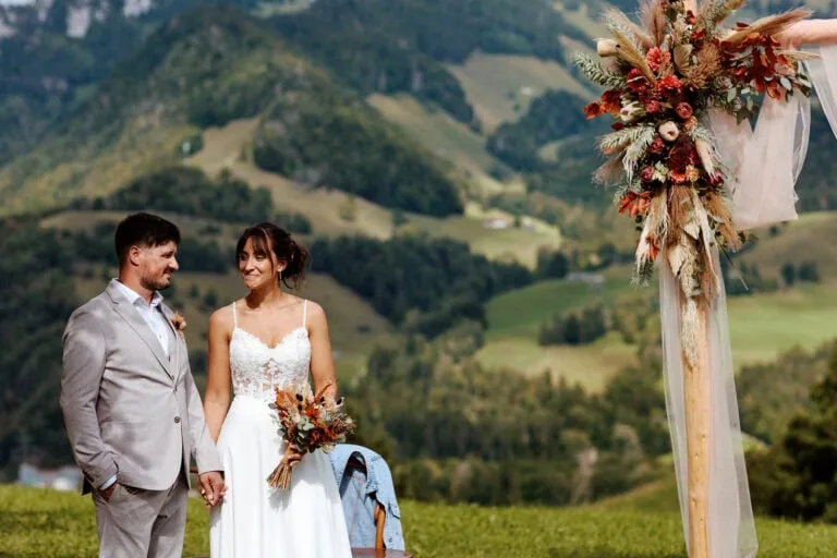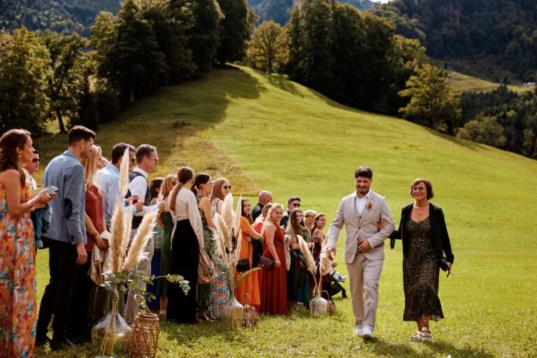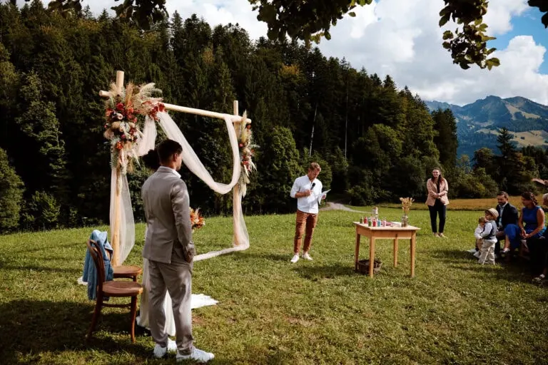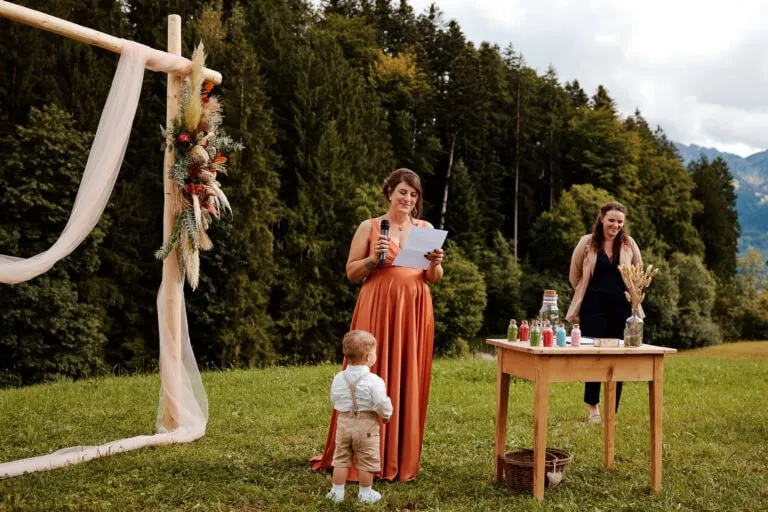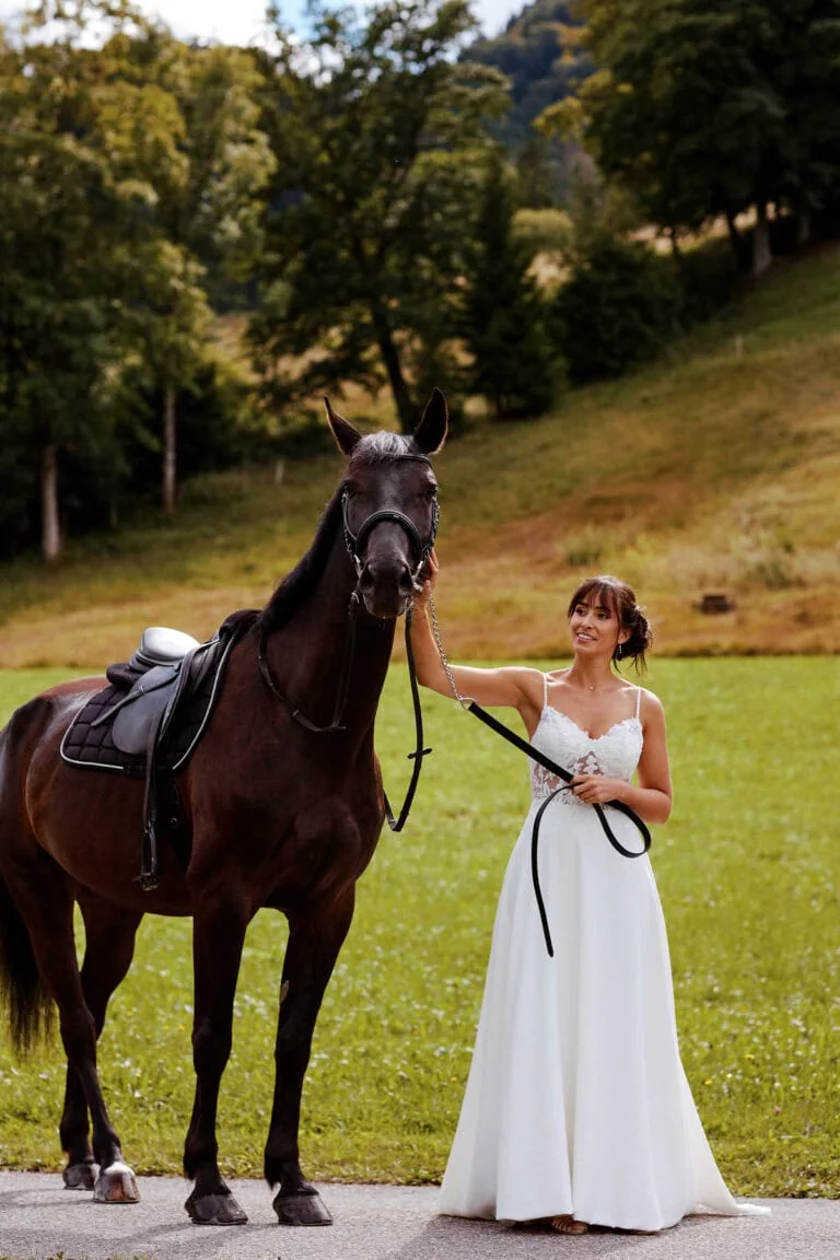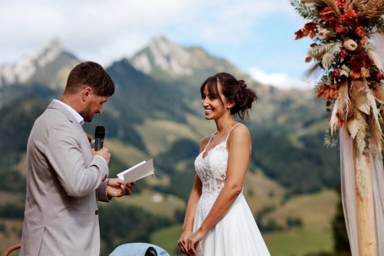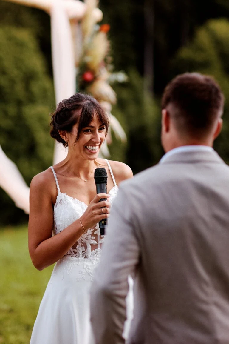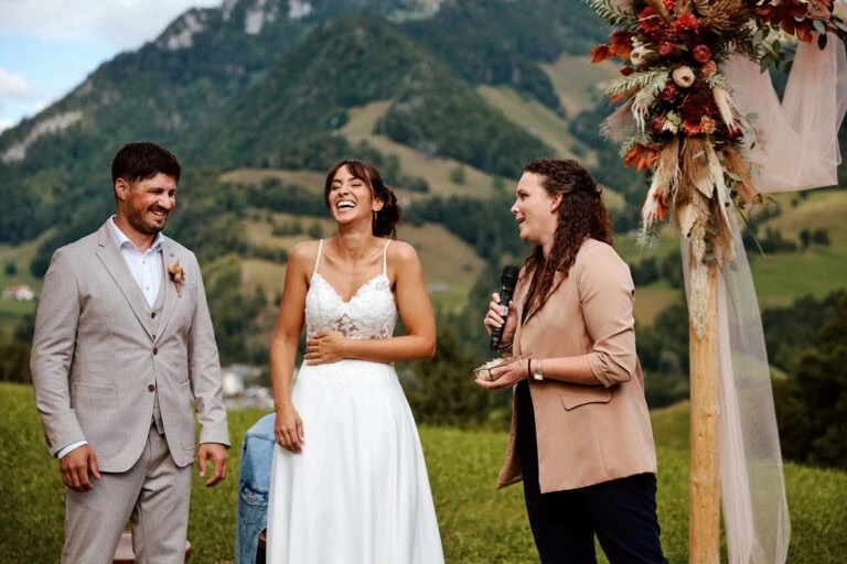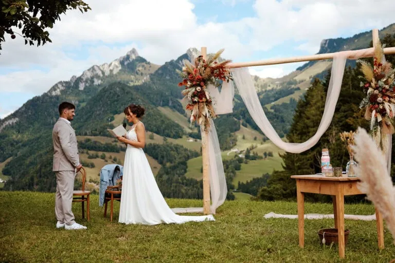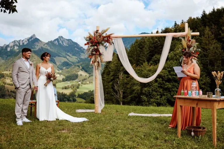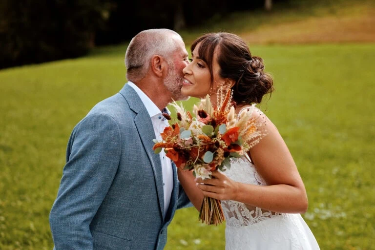 La cérémonie laïque s’est tenue en plein air, malgré une bonne pluie le matin, dans le pré juste à côté de la ferme. François est arrivé en 4×4, efficace. Sarah, elle, a fait son entrée à cheval, sa passion. Difficile de faire mieux pour une première apparition. Le genre de moment où tout le monde retient son souffle, surtout Sarah, et où moi j’ai le cœur qui palpite ! J’adore !