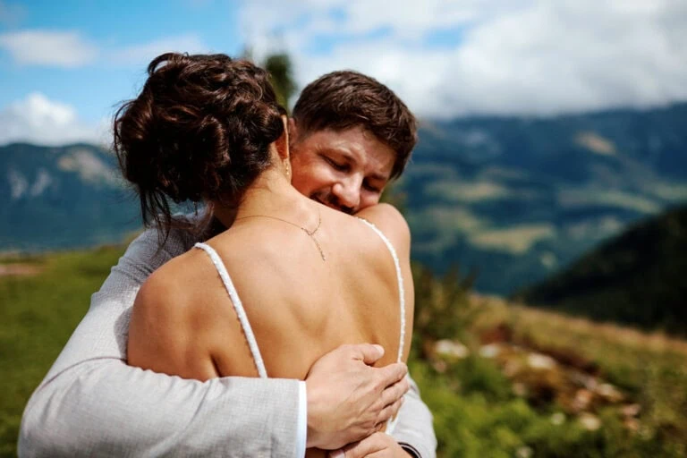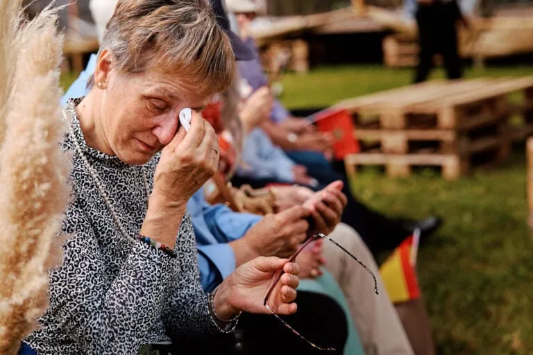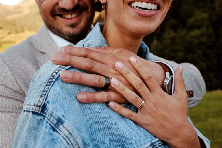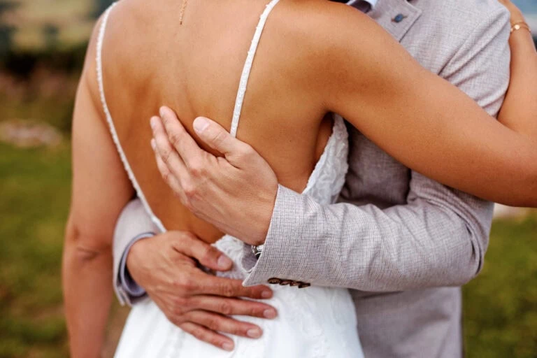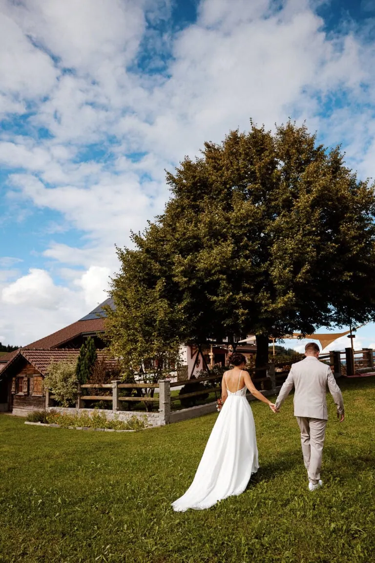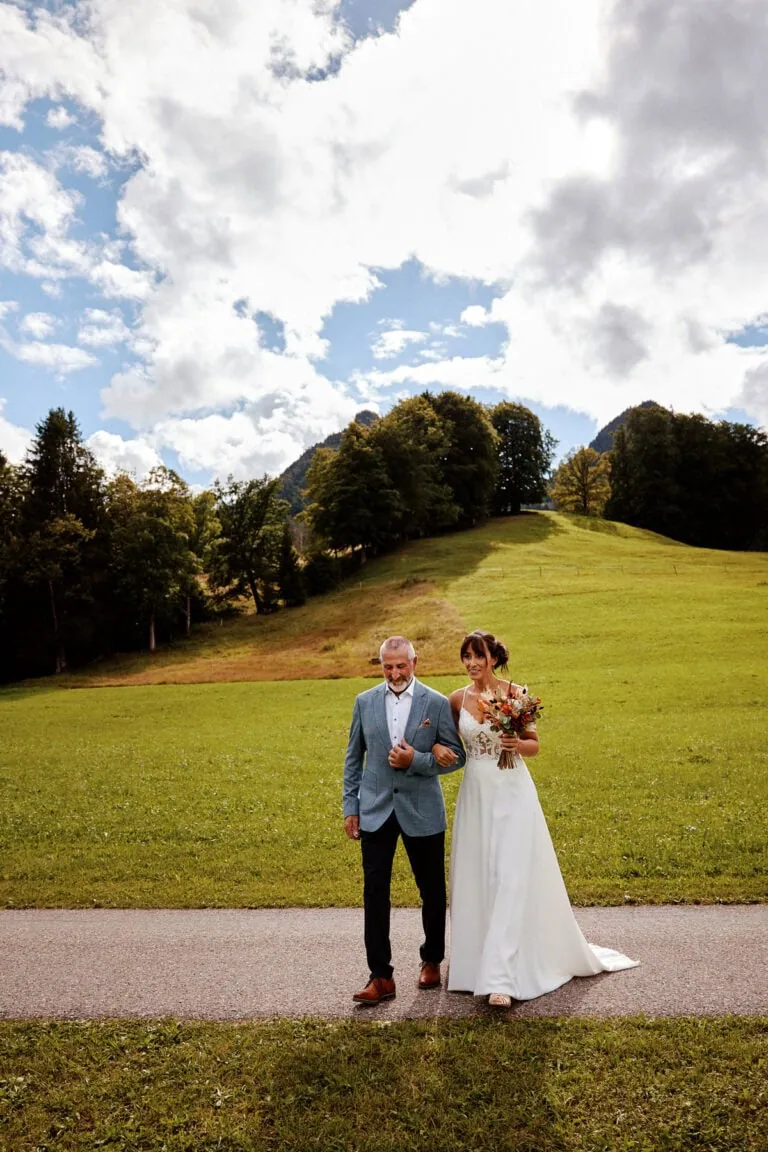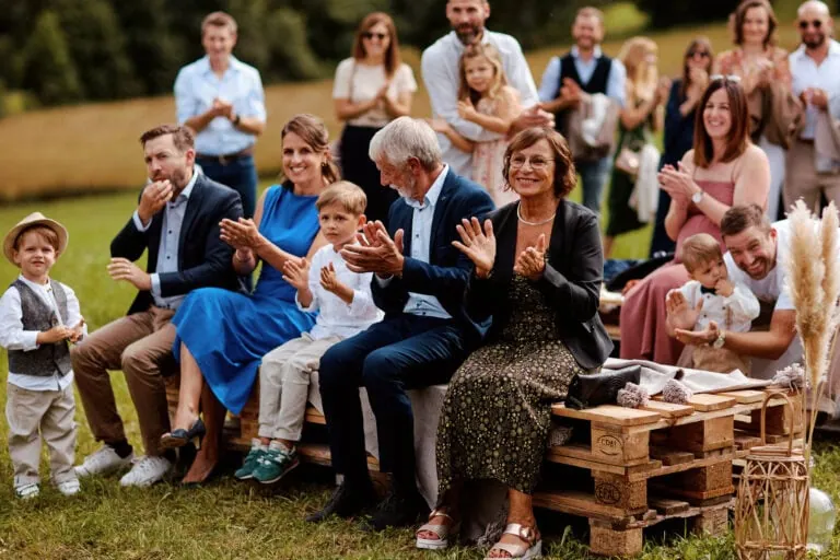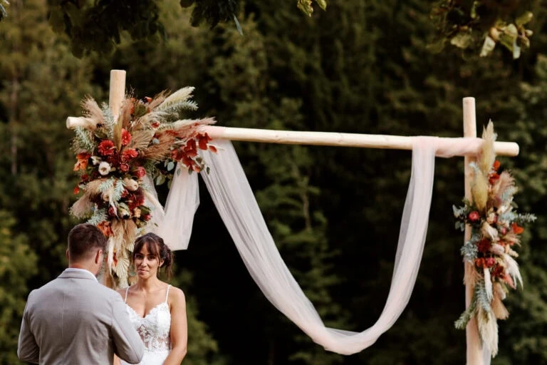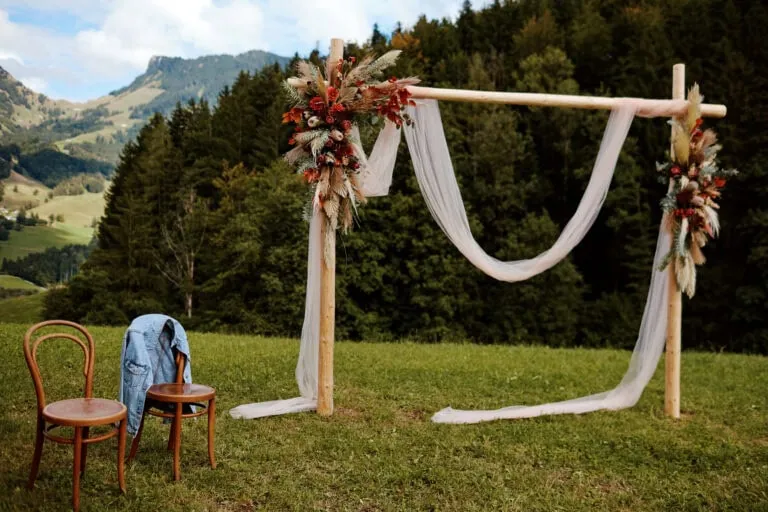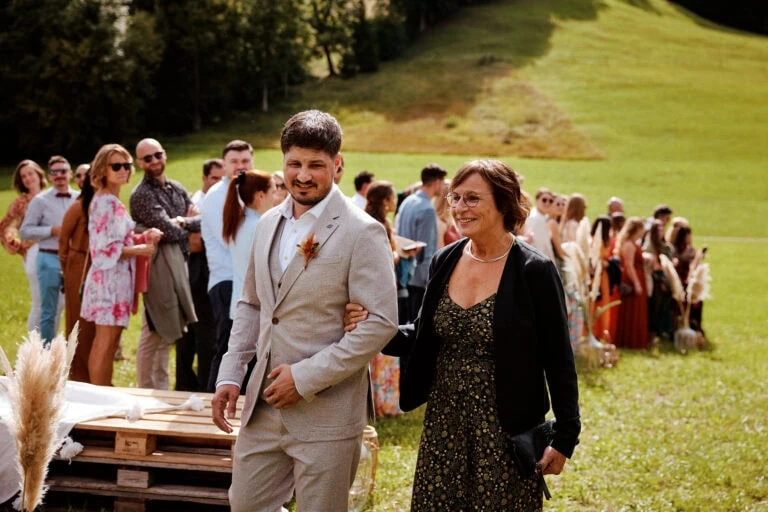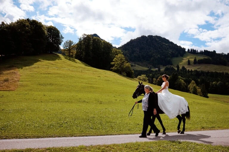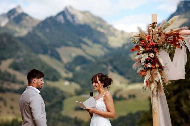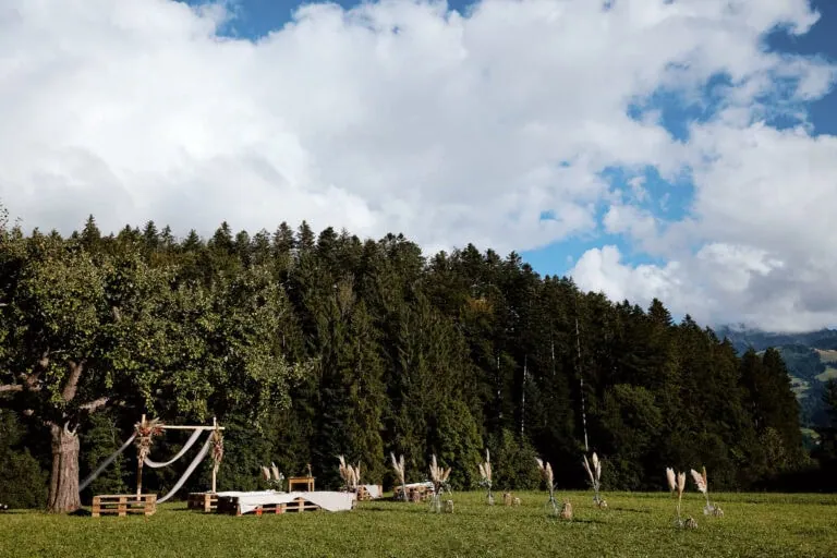 La cérémonie laïque s’est tenue en plein air, malgré une bonne pluie le matin, dans le pré juste à côté de la ferme. François est arrivé en 4×4, efficace. Sarah, elle, a fait son entrée à cheval, sa passion. Difficile de faire mieux pour une première apparition. Le genre de moment où tout le monde retient son souffle, surtout Sarah, et où moi j’ai le cœur qui palpite ! J’adore !