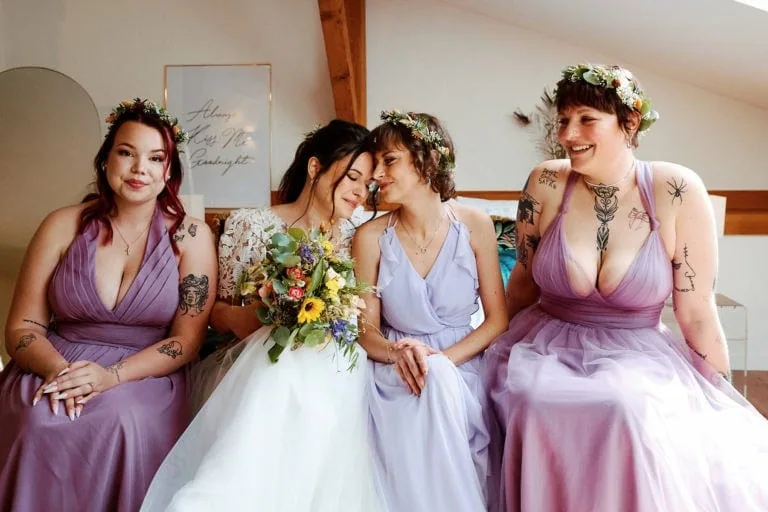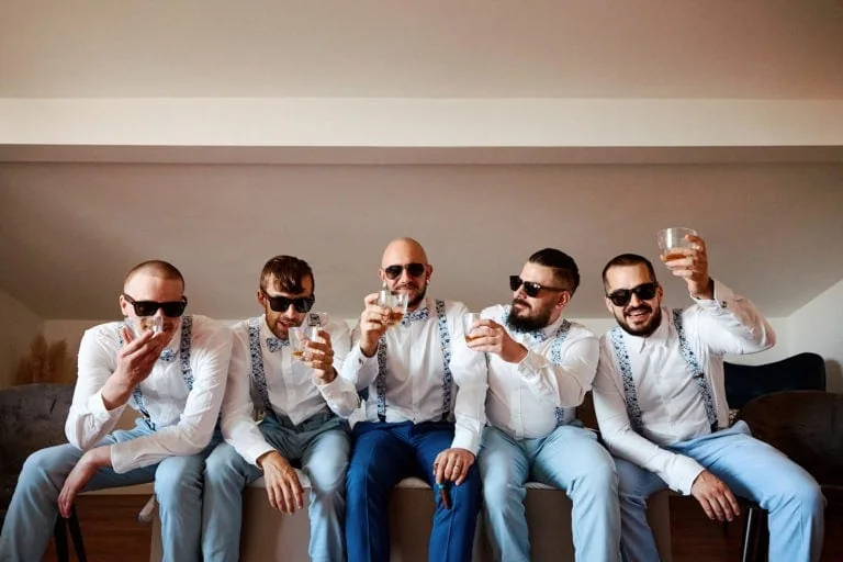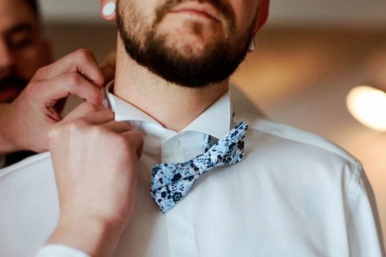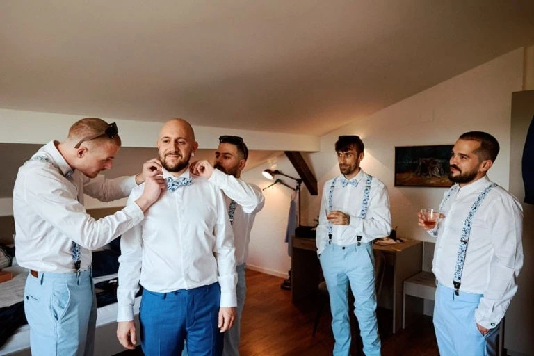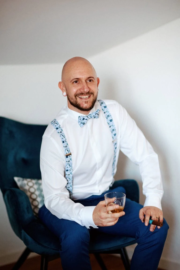 J’ai eu la chance de vivre ce mariage dès les préparatifs de Melody jusqu’à tard dans la nuit. Tout au long de cette journée, l’ambiance était complètement folle ! Après avoir photographié le maquillage et la coiffure de Melody, je me suis dirigé vers la chambre de Fred, où ses potes l’ont aidé à se préparer (et à entamer une bouteille de whisky).