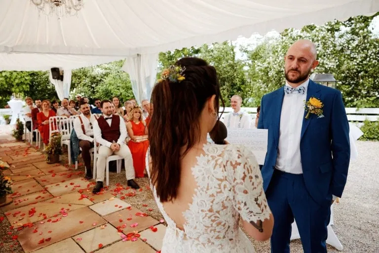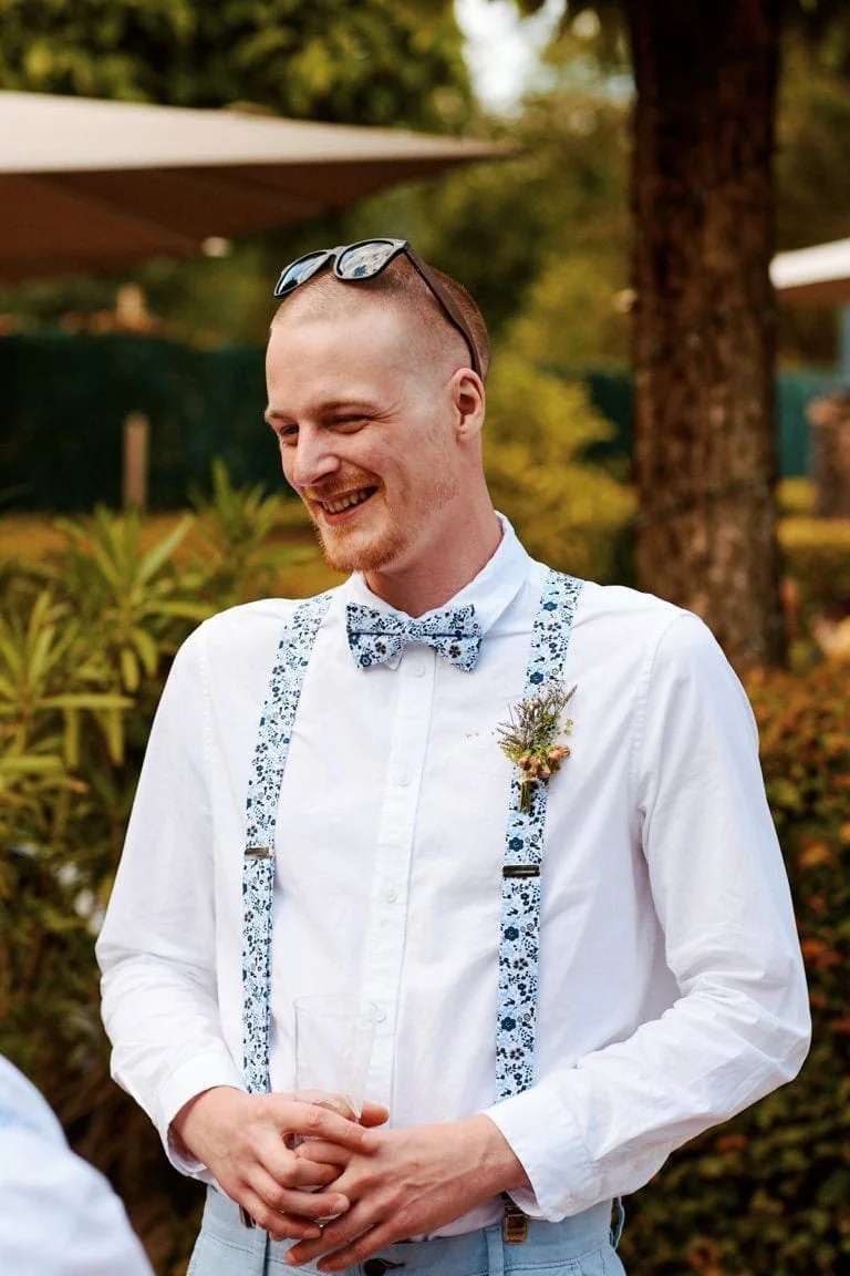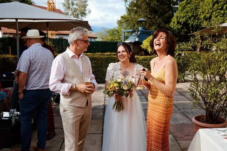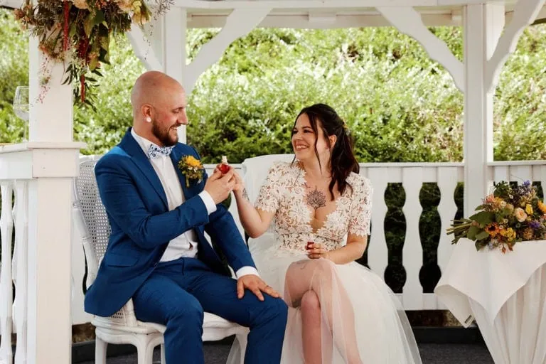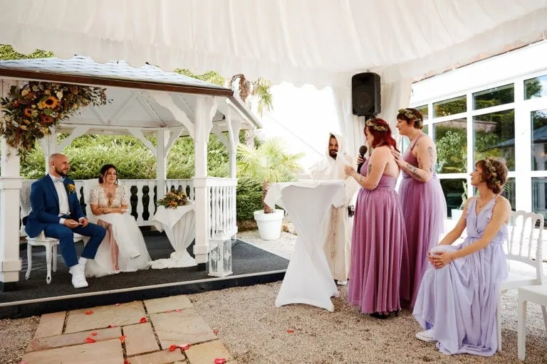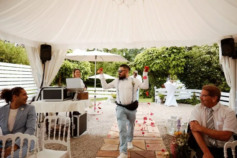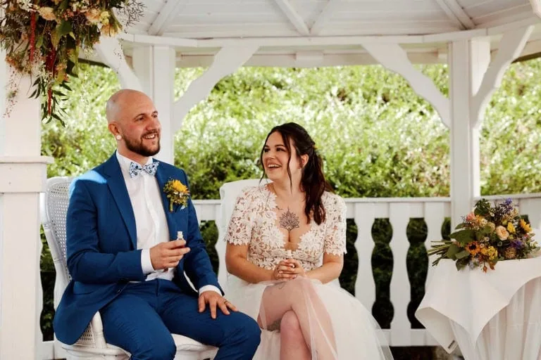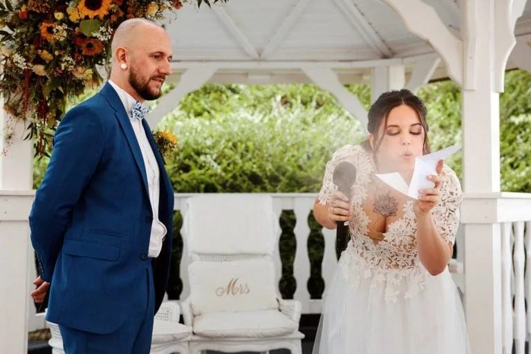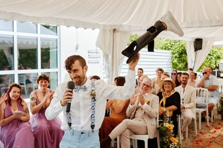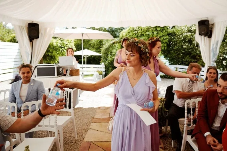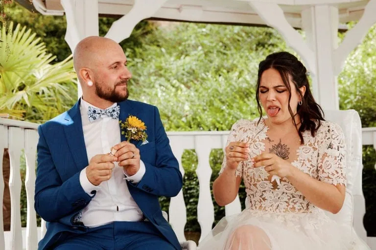 Quelques minutes plus tard, nous avons rejoint les invités pour une cérémonie laïque toujours au Pont de Thielle, dirigée avec beaucoup d’humour et d’émotion par un ami proche du couple, déguisé pour l’occasion en moine ! On pouvait sentir toute l’attention et la complicité entre les invités, entre éclats de rire et moments chargés d’émotion. Chaque instant semblait plus sincère et touchant que le précédent. Melody et Fred se sont échangé leurs vœux. Melody a ouvert le bal en se débarrassant avec humour de la « poussière » sur ses vœux, un moment vraiment drôle ! En guise d’échange d’alliance les mariés ont partagé une fiole de liquide difficilement descriptible pour moi ! Fred à apparemment apprécié, on ne peut pas en dire autant de Melo !