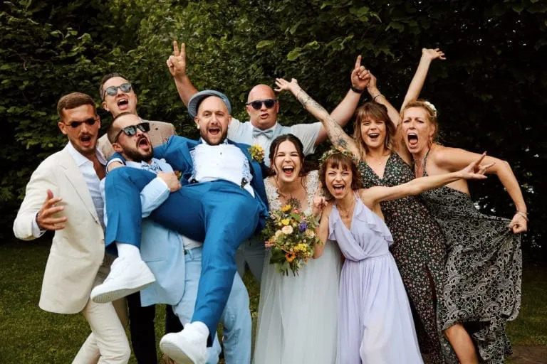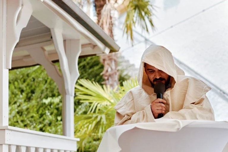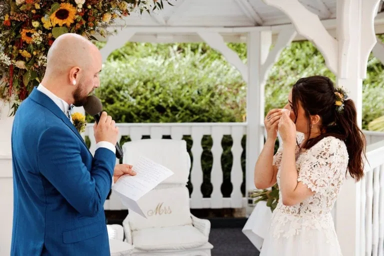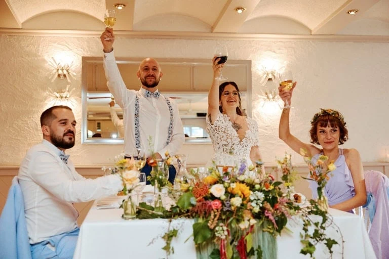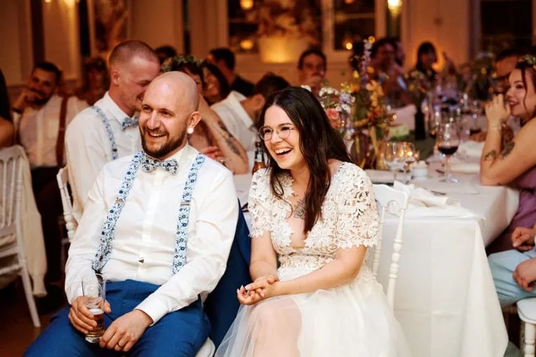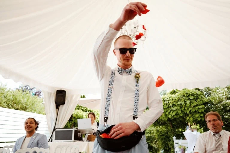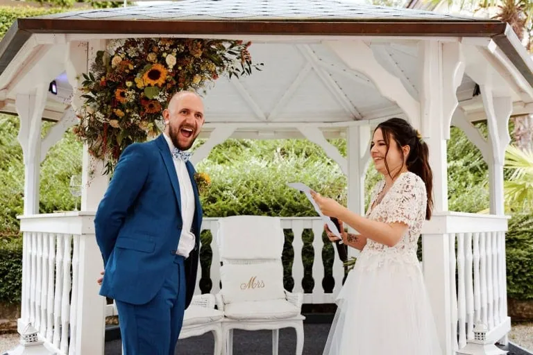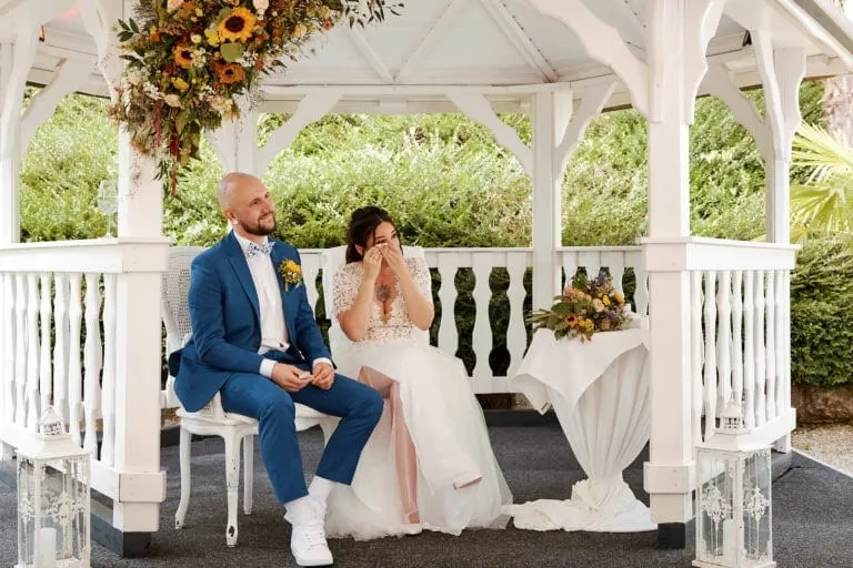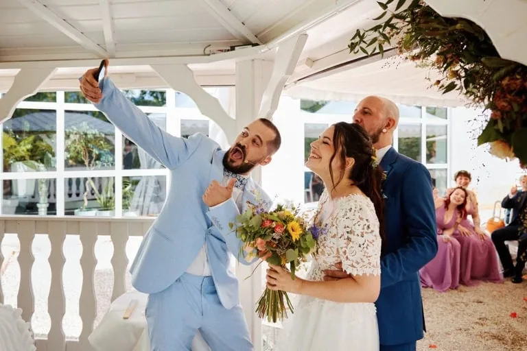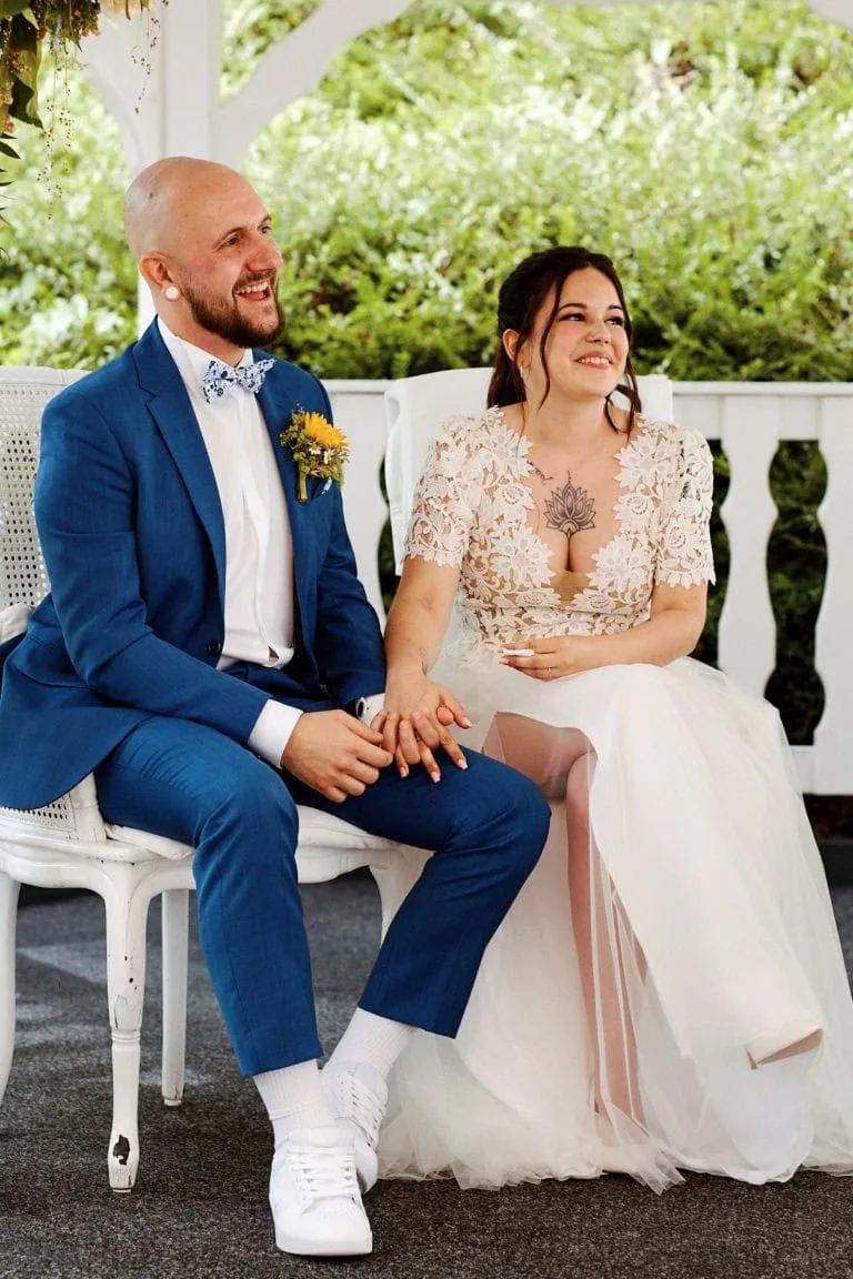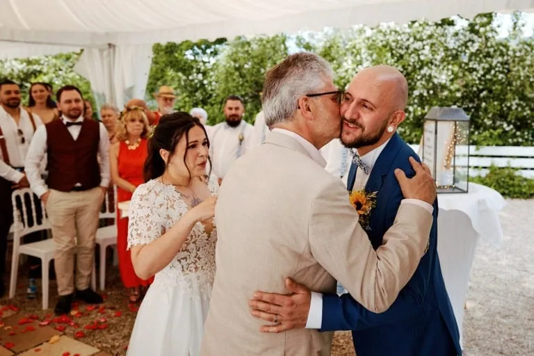 Quelques minutes plus tard, nous avons rejoint les invités pour une cérémonie laïque toujours au Pont de Thielle, dirigée avec beaucoup d’humour et d’émotion par un ami proche du couple, déguisé pour l’occasion en moine ! On pouvait sentir toute l’attention et la complicité entre les invités, entre éclats de rire et moments chargés d’émotion. Chaque instant semblait plus sincère et touchant que le précédent. Melody et Fred se sont échangé leurs vœux. Melody a ouvert le bal en se débarrassant avec humour de la « poussière » sur ses vœux, un moment vraiment drôle ! En guise d’échange d’alliance les mariés ont partagé une fiole de liquide difficilement descriptible pour moi ! Fred à apparemment apprécié, on ne peut pas en dire autant de Melo !