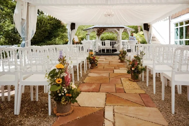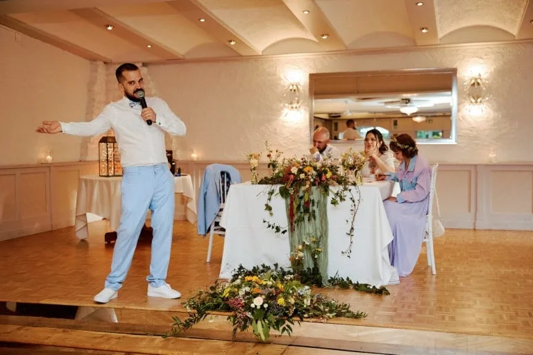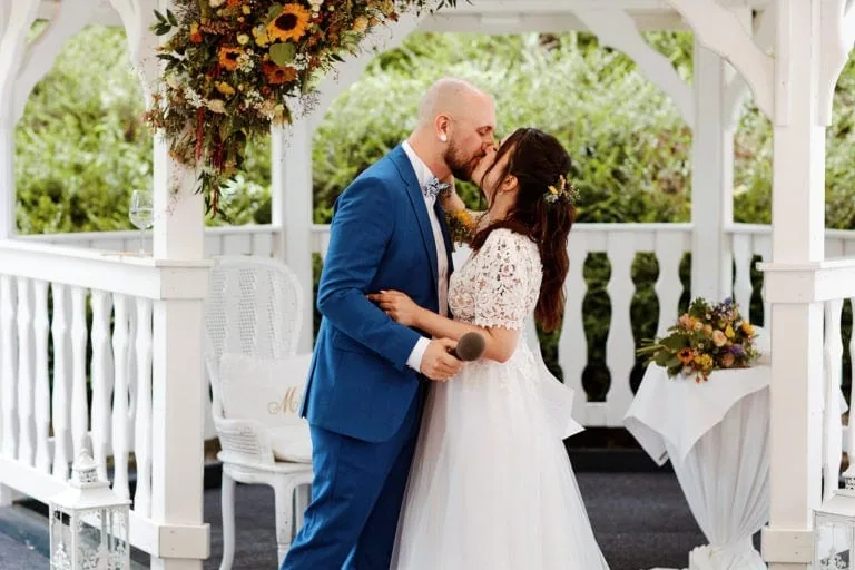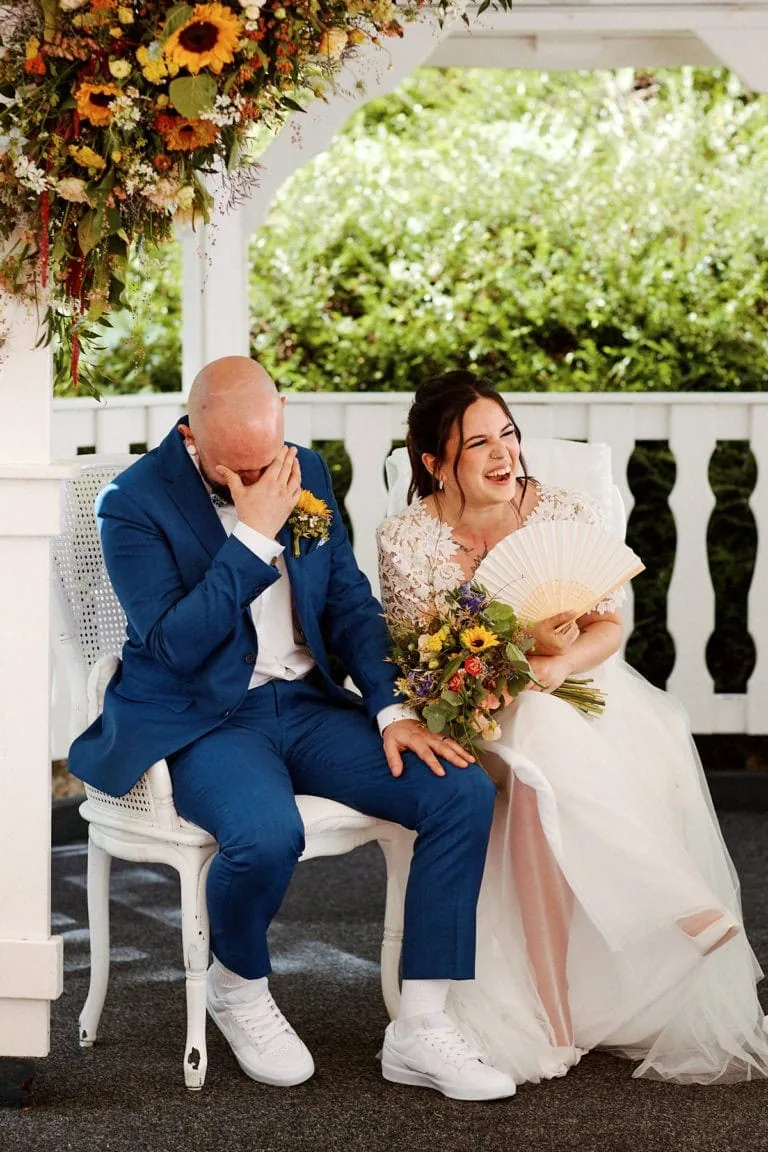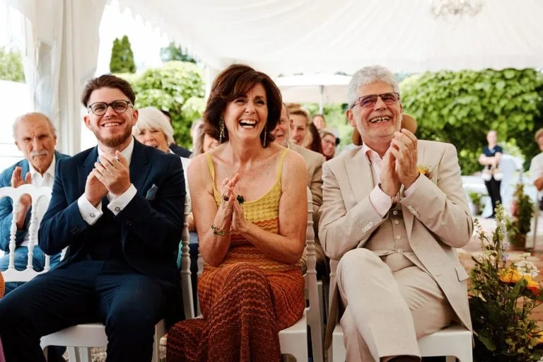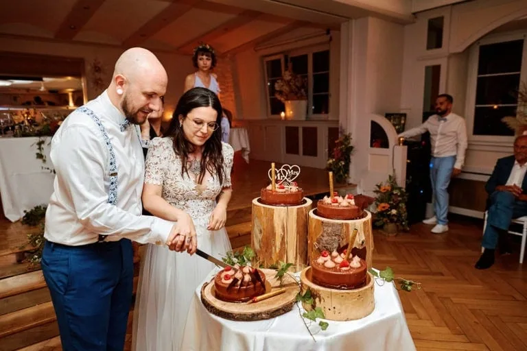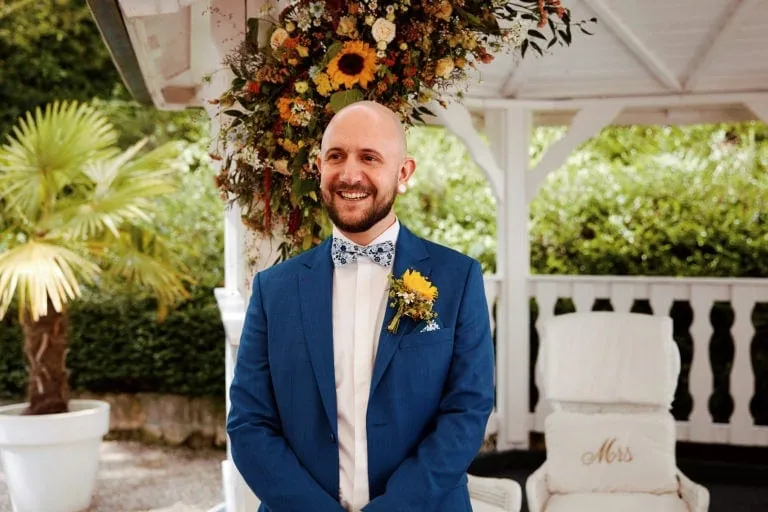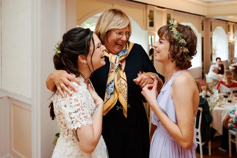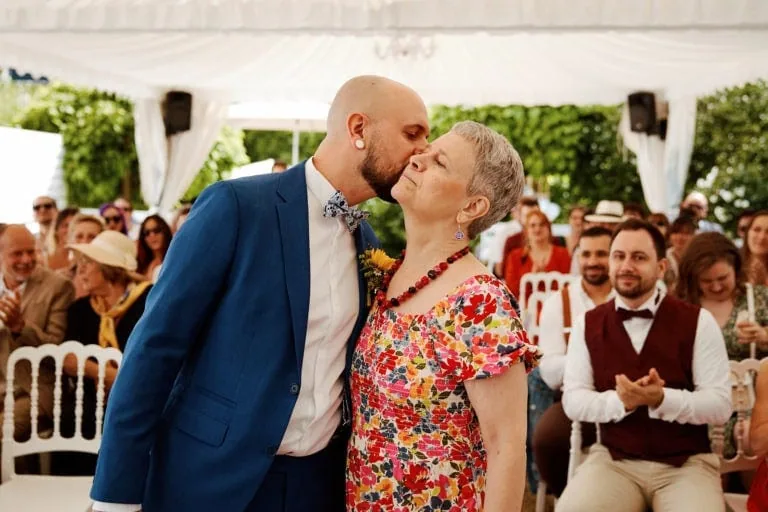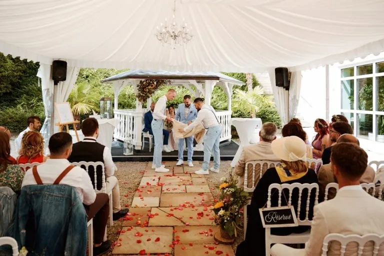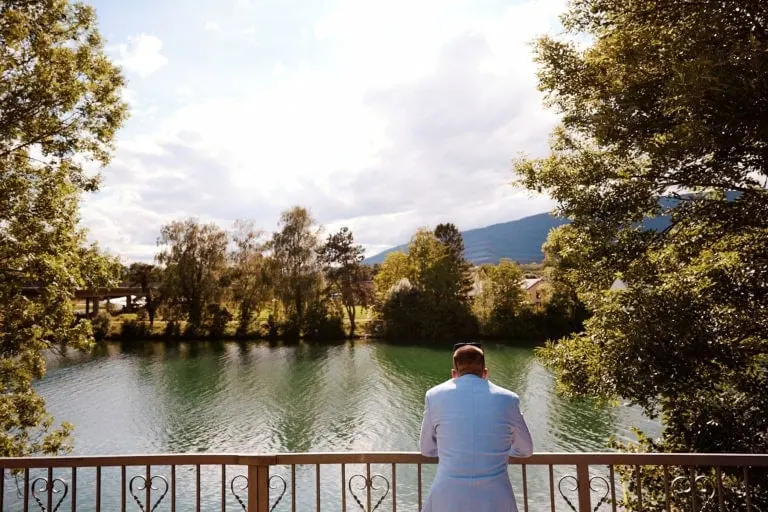 Quelques minutes plus tard, nous avons rejoint les invités pour une cérémonie laïque toujours au Pont de Thielle, dirigée avec beaucoup d’humour et d’émotion par un ami proche du couple, déguisé pour l’occasion en moine ! On pouvait sentir toute l’attention et la complicité entre les invités, entre éclats de rire et moments chargés d’émotion. Chaque instant semblait plus sincère et touchant que le précédent. Melody et Fred se sont échangé leurs vœux. Melody a ouvert le bal en se débarrassant avec humour de la « poussière » sur ses vœux, un moment vraiment drôle ! En guise d’échange d’alliance les mariés ont partagé une fiole de liquide difficilement descriptible pour moi ! Fred à apparemment apprécié, on ne peut pas en dire autant de Melo !