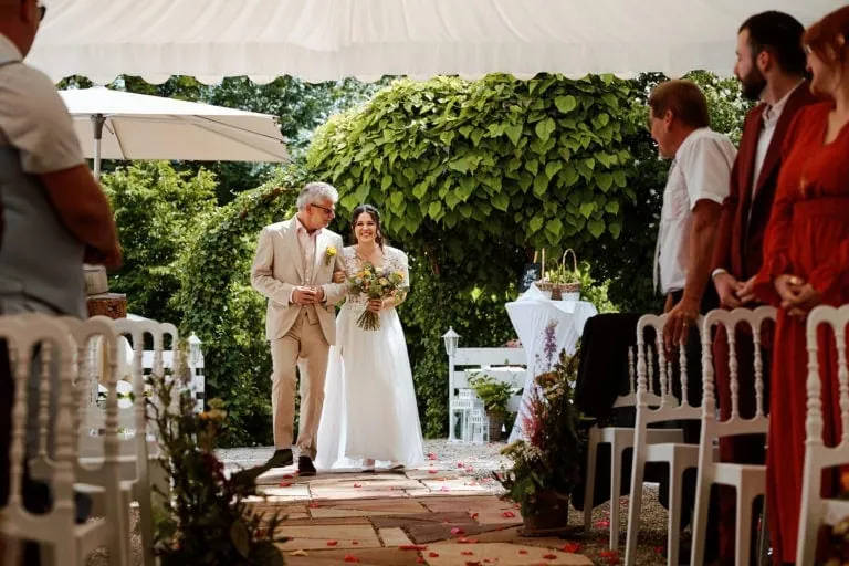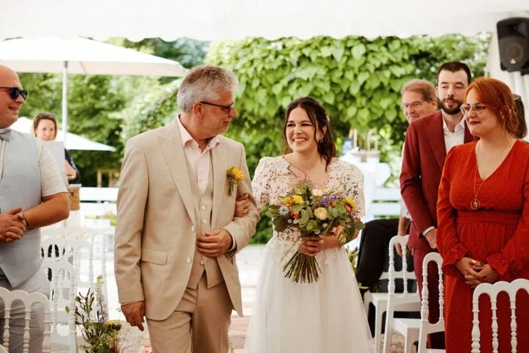 Après un first touch des mariés sans se voir, le papa de Melody est venu la chercher dans sa chambre. Melody lui avait réservé une belle surprise : une lettre de remerciement qu’elle lui a lue. Les premières larmes de la journée ont commencé à couler !