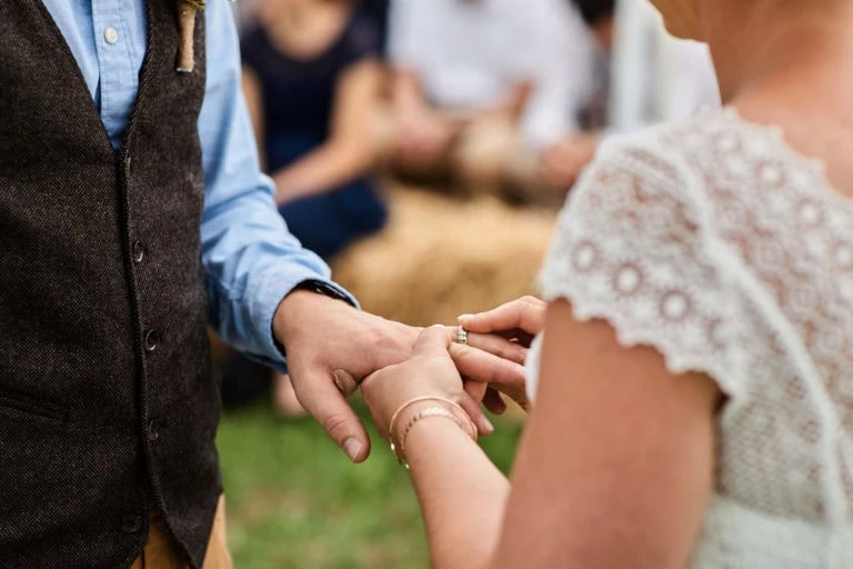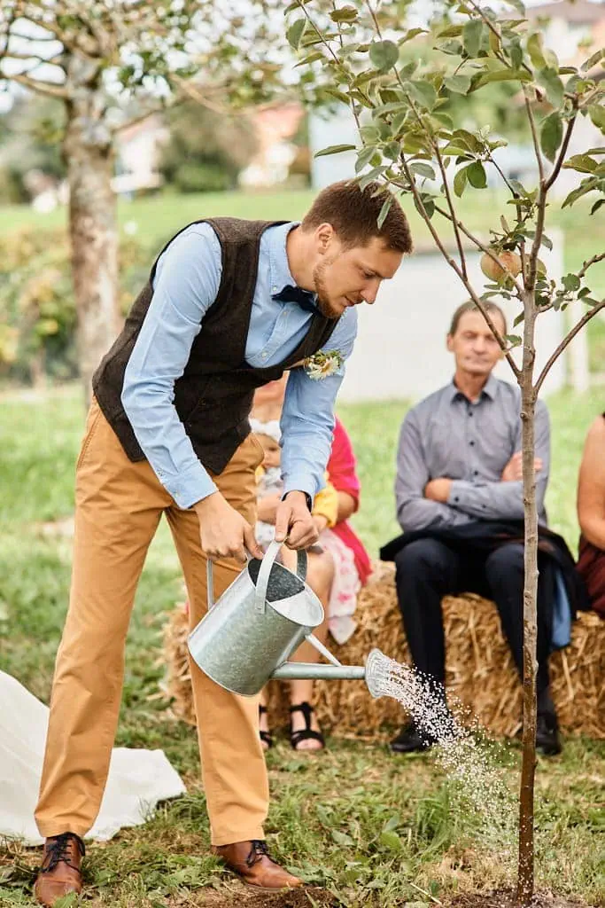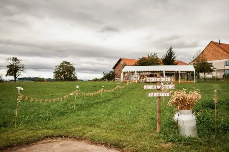 Un pré, une tente, des bottes paille et de très belles décorations ! La formule magique d’une cérémonie en plein-air réussis ! La cérémonie était marquée par un symbole très fort pour ces amoureux de la nature et du jardin. Accompagnés de leurs témoins, ils ont planté un arbre dans ce qui sera plus tard le verger de leur maison !