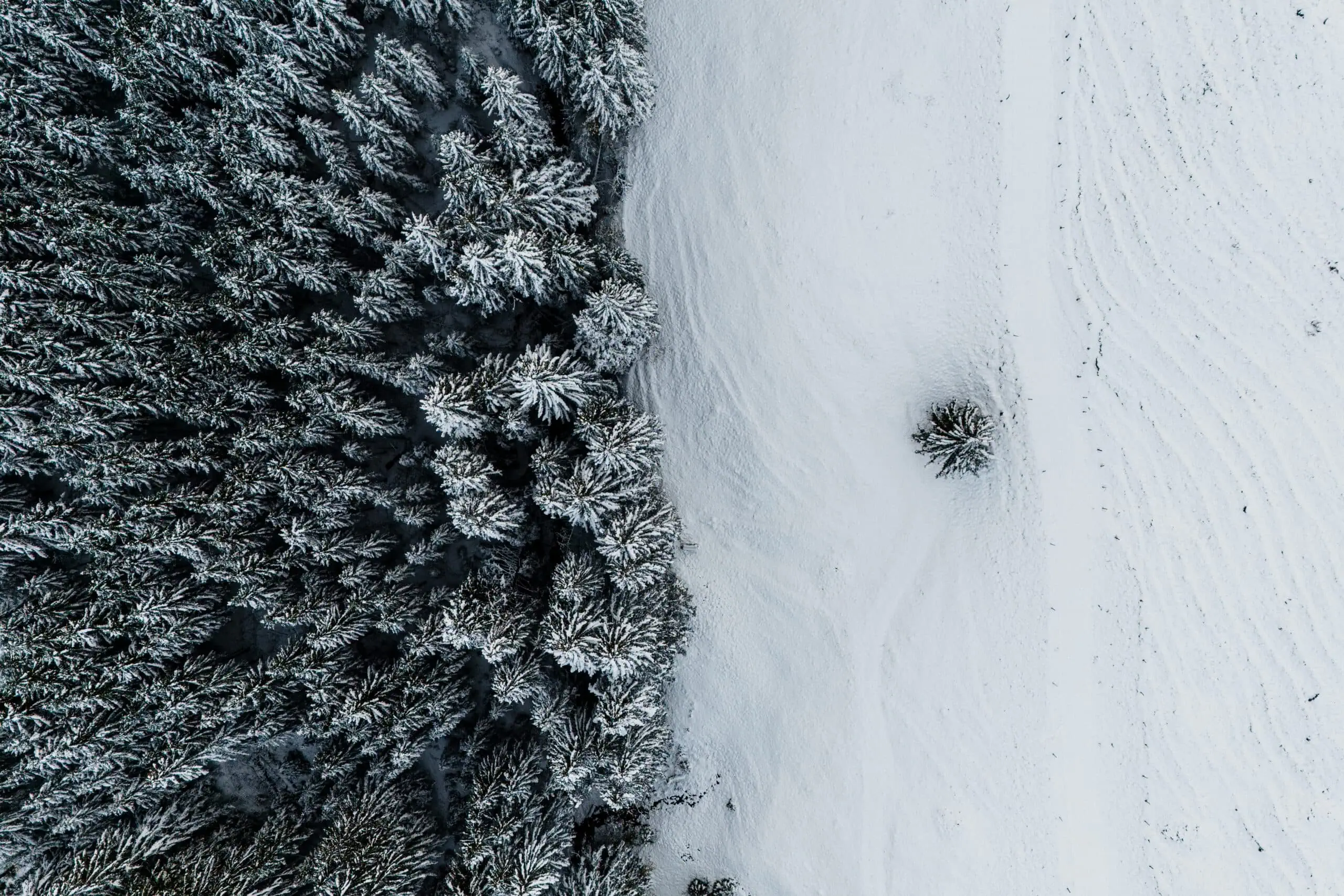 La ligne est nette. À gauche, la forêt de sapins enneigés et dense. À droite, l’alpage recouvert d’un blanc immaculé, presque vide, presque, parce qu’un seul petit sapin s’est aventuré hors de la forêt, seul au milieu de toute cette neige.