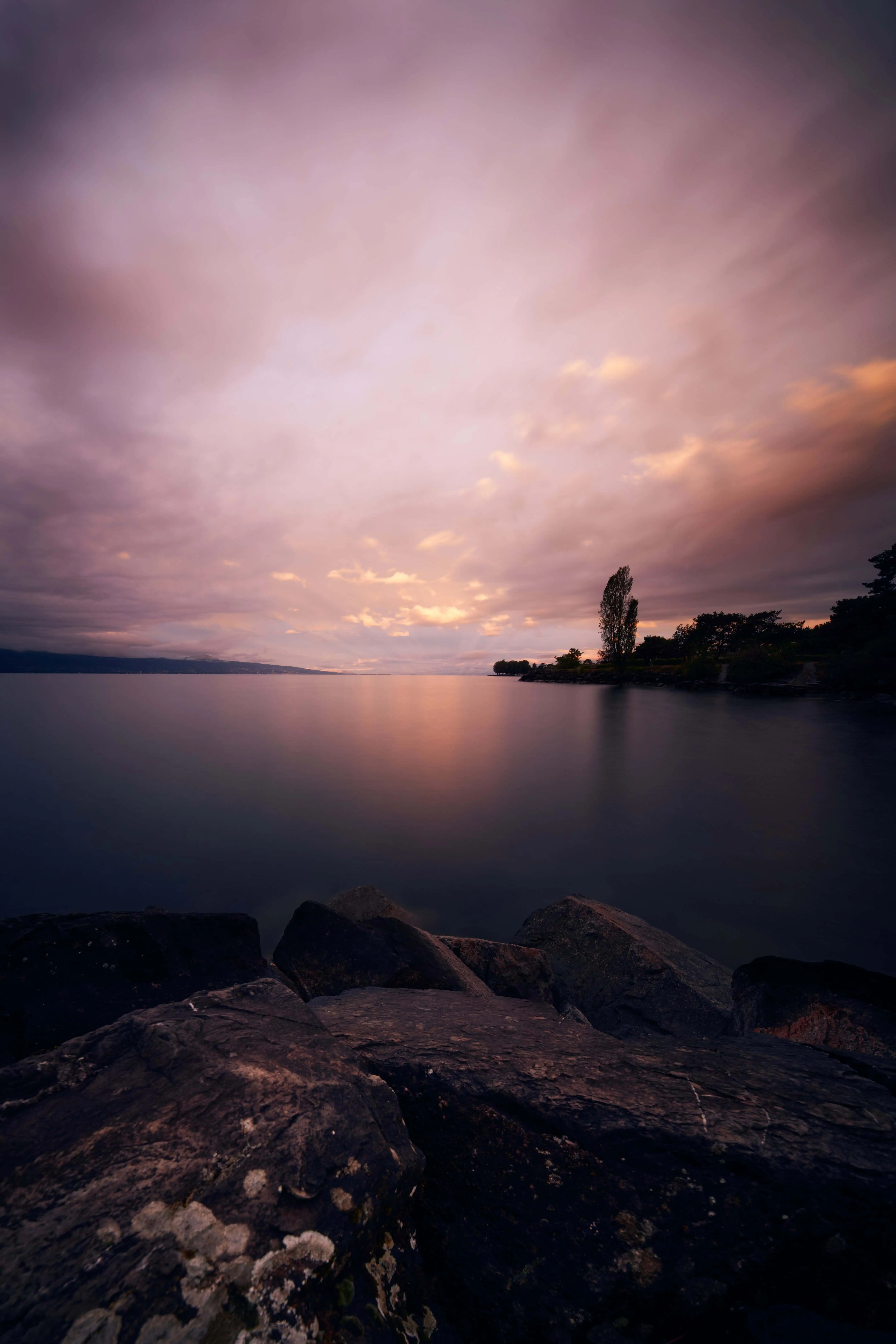La pose longue a tout adouci, tout ralenti. C’est exactement l’atmosphère d’un bord du Léman en fin de journée, quand les promeneurs sont rentrés et que la lumière fait ce qu’elle veut.