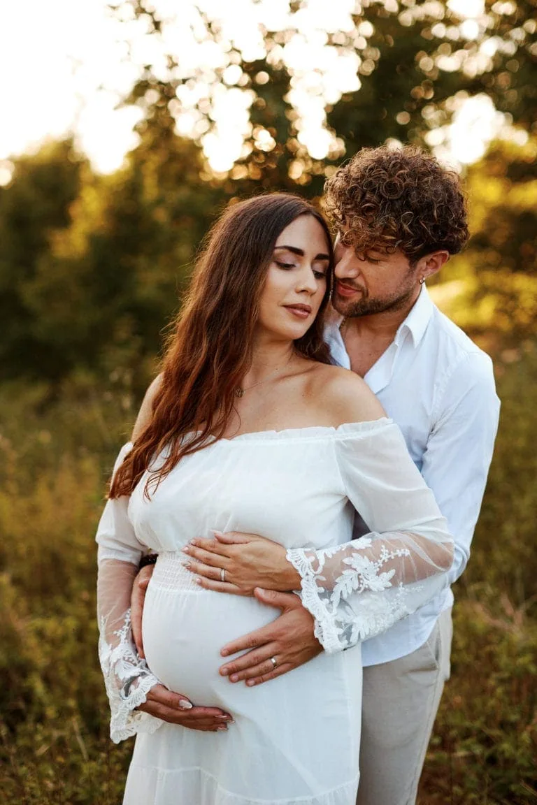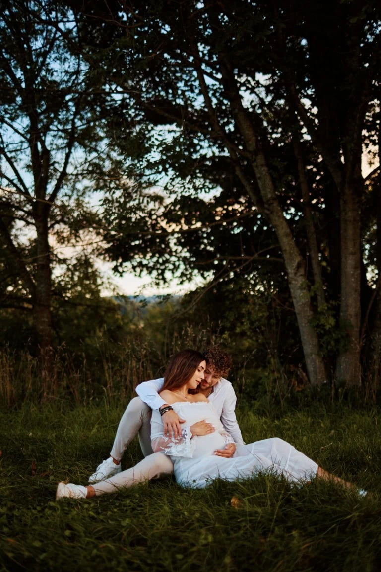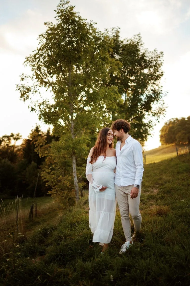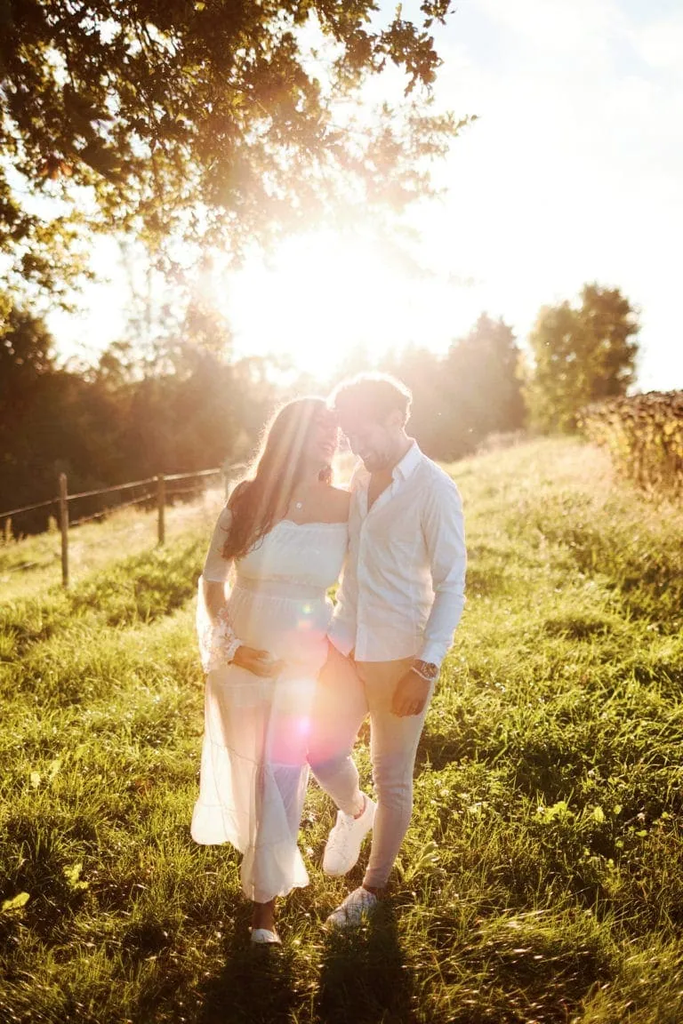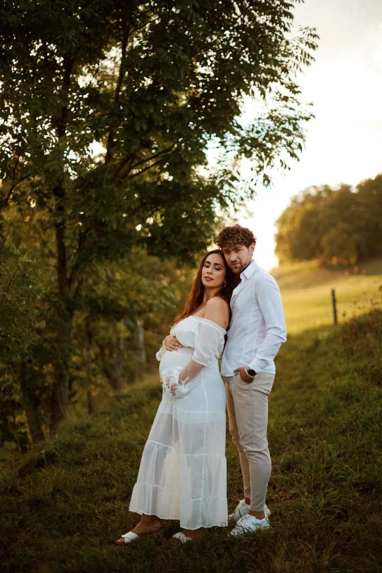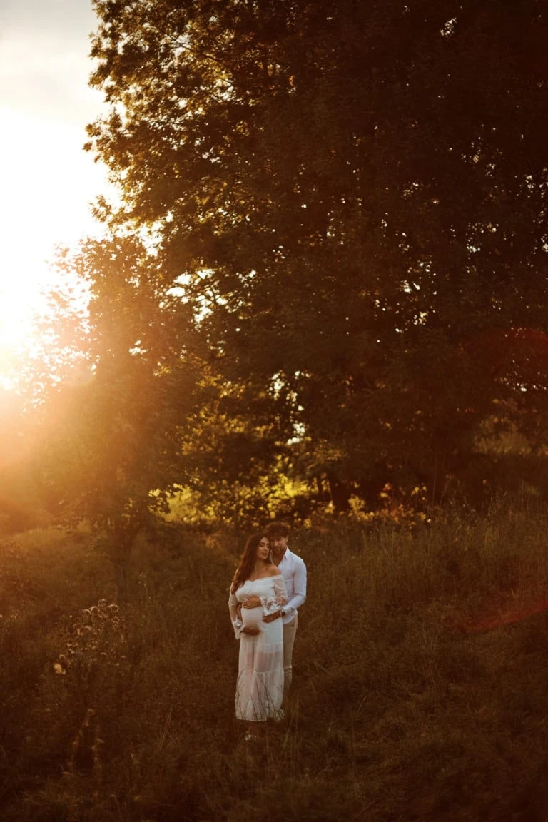 La séance photo de grossesse s’est déroulée dans un cadre absolument magnifique, un endroit tout simple, mais choisi avec soin. Le moment de la journée est aussi très important, la fin de journée est parfaite pour son atmosphère unique et sa lumière douce. Ce moment de la journée, où le ciel se pare de teintes chaudes et enveloppantes, offre un arrière-plan parfait pour immortaliser la beauté et l’intensité des émotions liées à l’attente d’un enfant.