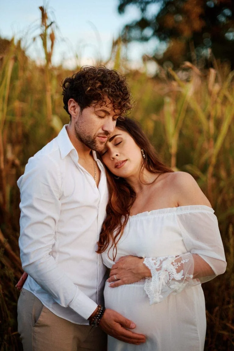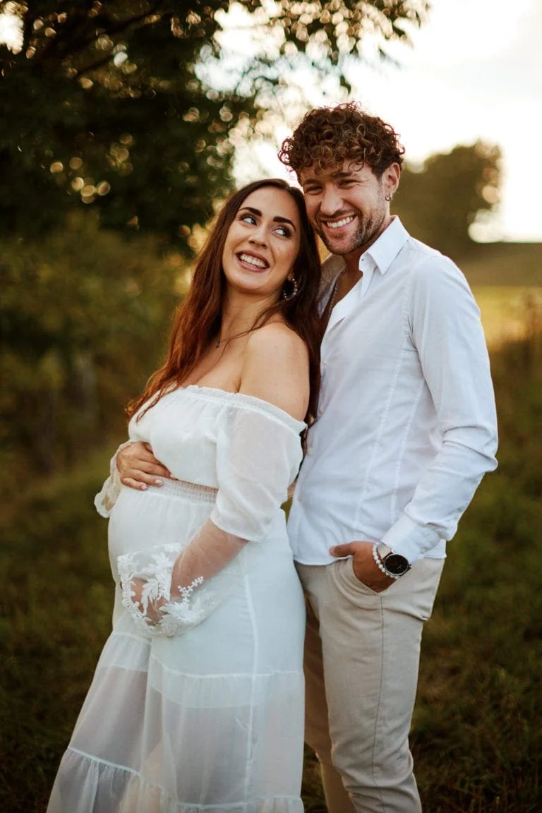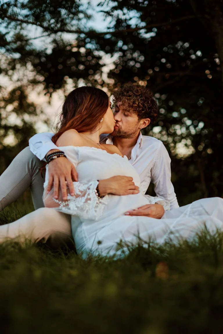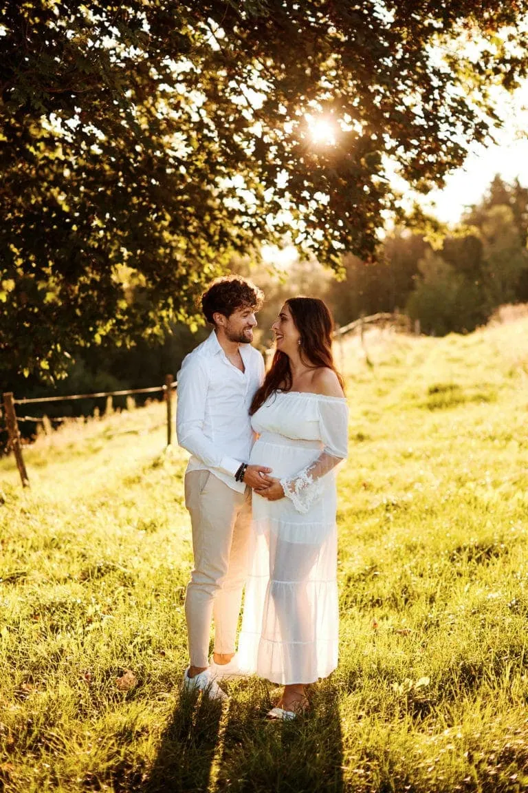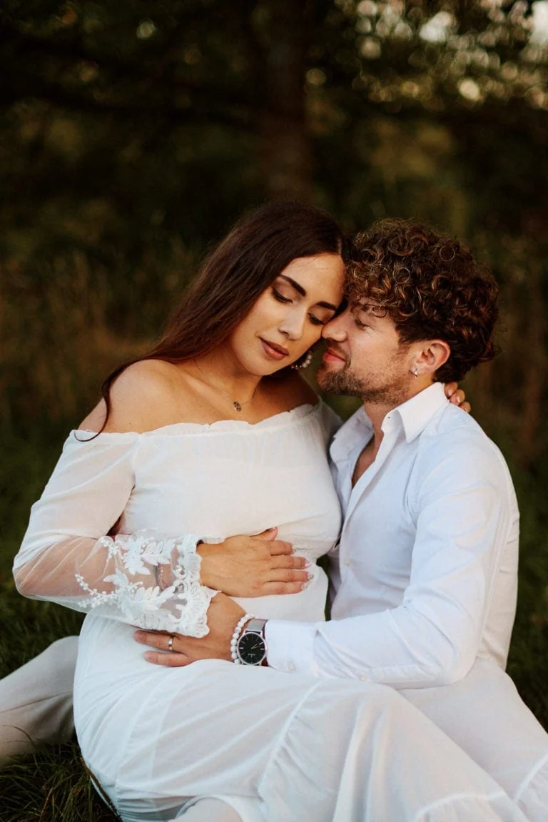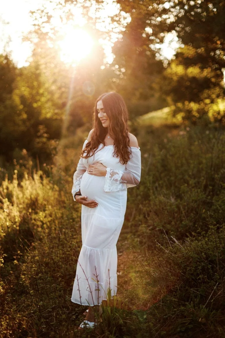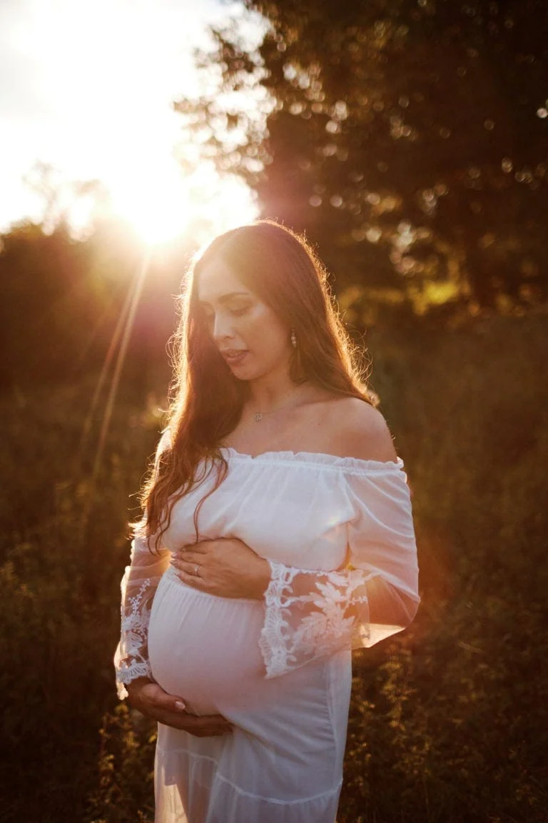 La séance photo de grossesse s’est déroulée dans un cadre absolument magnifique, un endroit tout simple, mais choisi avec soin. Le moment de la journée est aussi très important, la fin de journée est parfaite pour son atmosphère unique et sa lumière douce. Ce moment de la journée, où le ciel se pare de teintes chaudes et enveloppantes, offre un arrière-plan parfait pour immortaliser la beauté et l’intensité des émotions liées à l’attente d’un enfant.